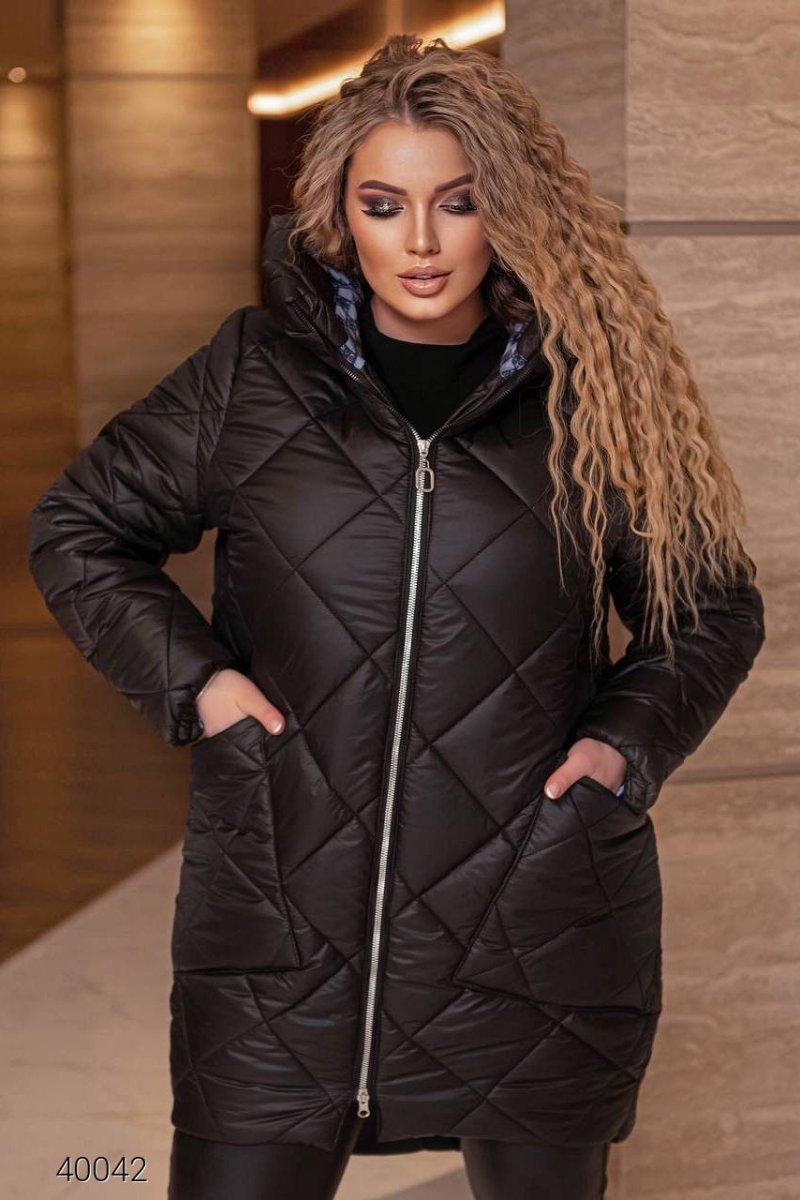 Куртка из стеганой плащевой ткани на синтепоне. Ворот-стойка, манжеты на резинке, накладные боковые карманы. Асимметричный нижний край, есть подкладка, застёжка на молнию.