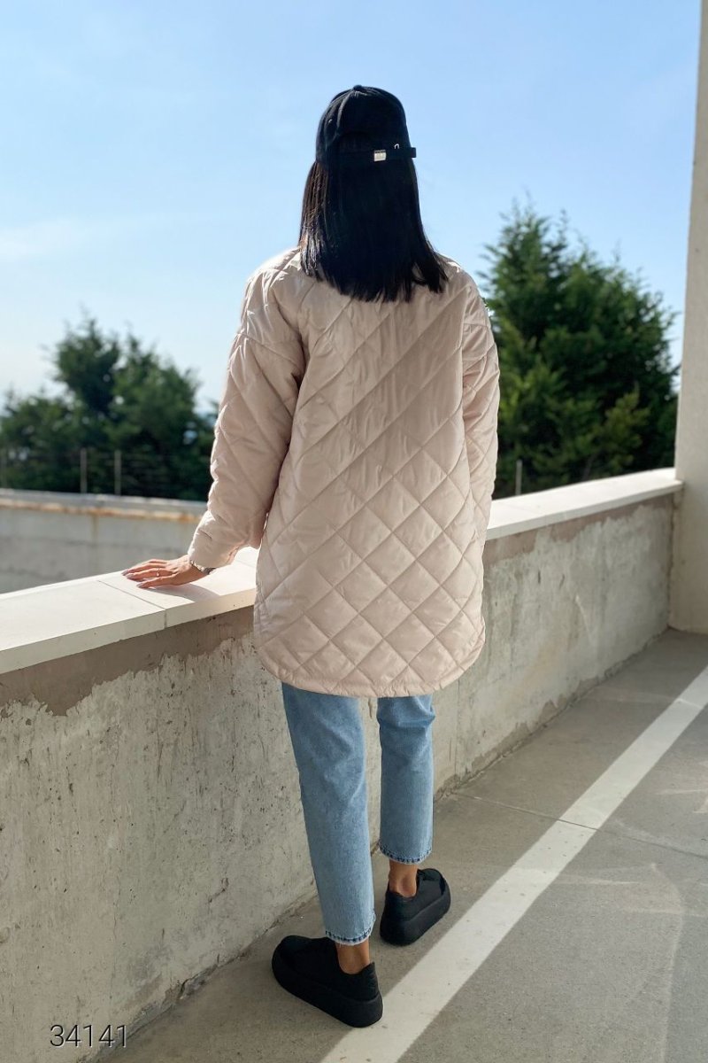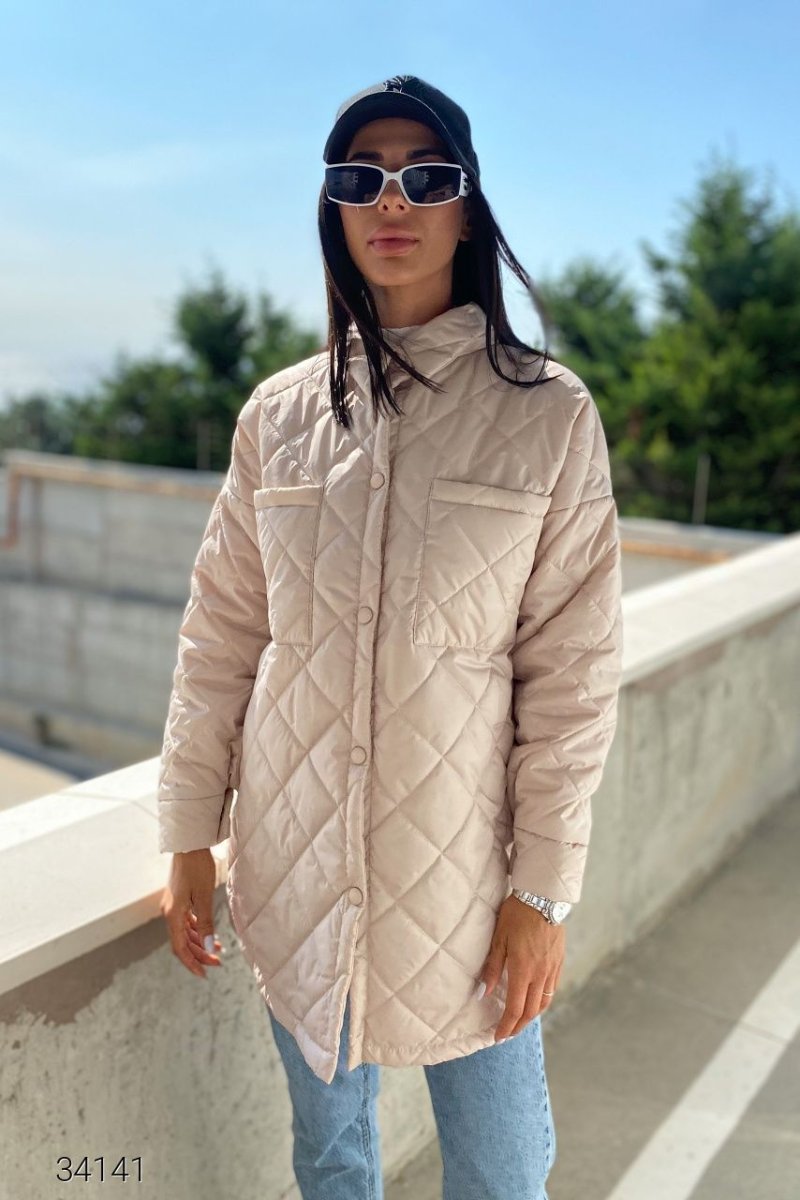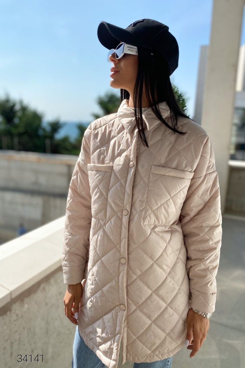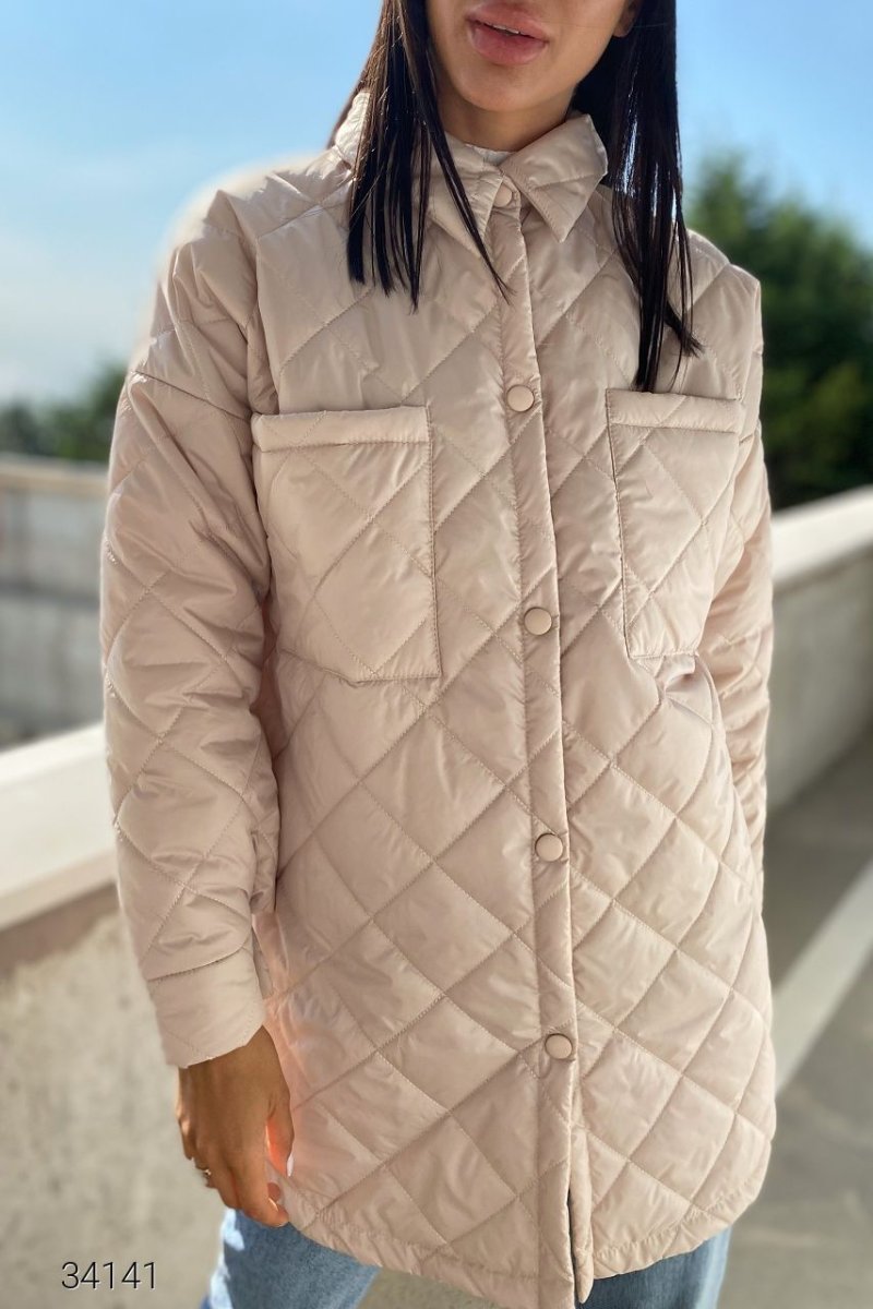 Куртка свободного кроя из стеганной плащевки. Отложной ворот, заниженная линия плеч, накладные нагрудные карманы. Фигурные боковые вырезы по нижней кромке, есть подкладка, манжеты и планка на кнопках.