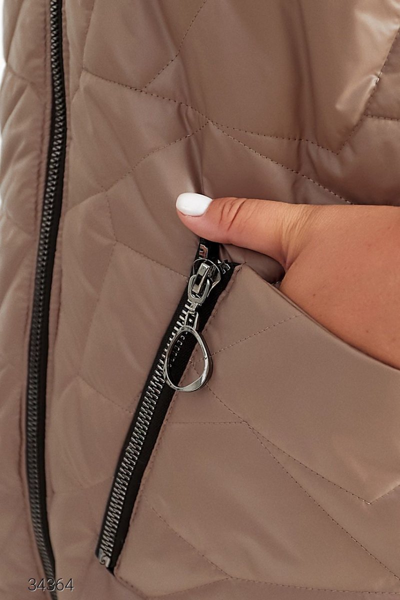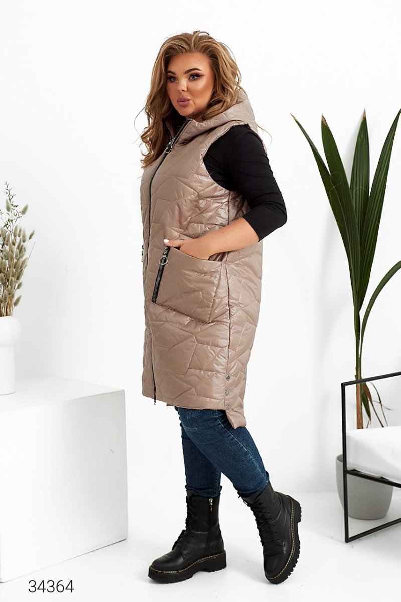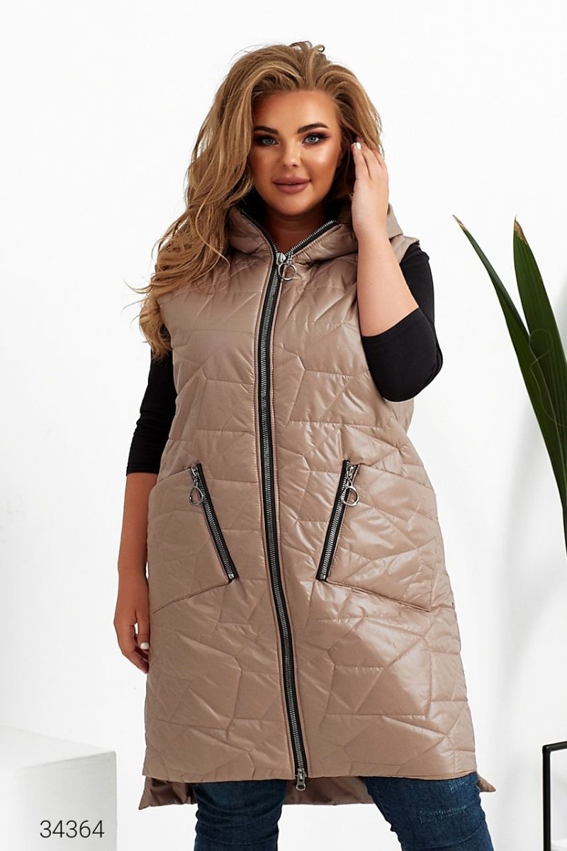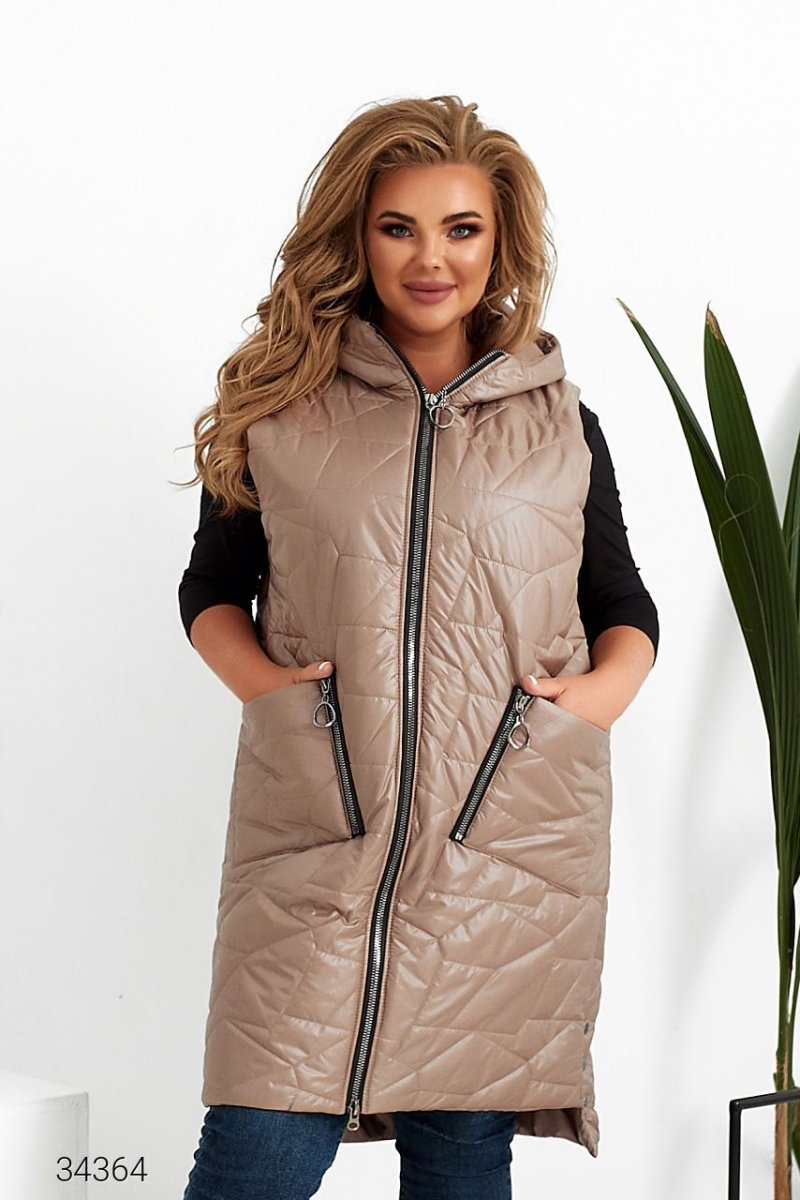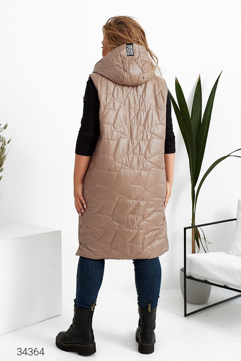 Стеганный дутый жилет из плащёвки на синтепоне. Объёмный капюшон с нашивкой, накладные карманы с декоративными молниями. Асимметричный нижний край с декоративными кнопками по бокам, застёжка на молнию.