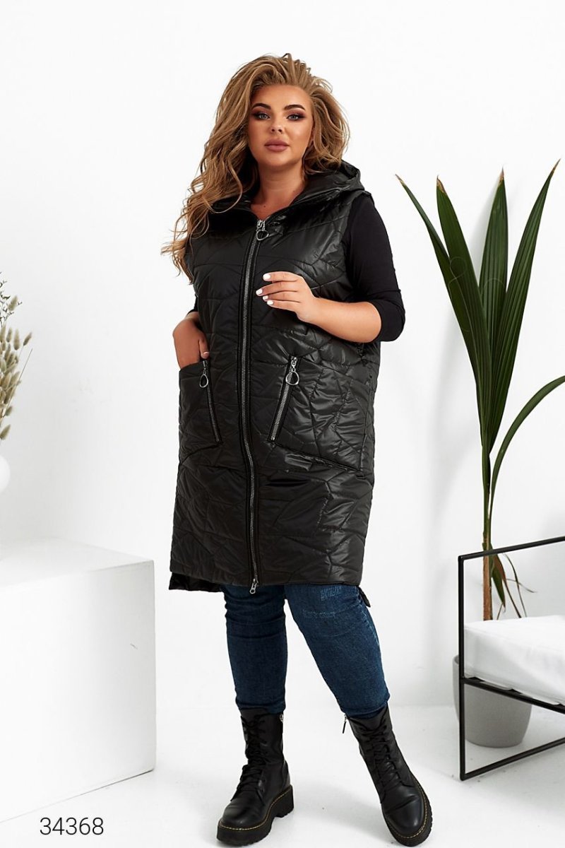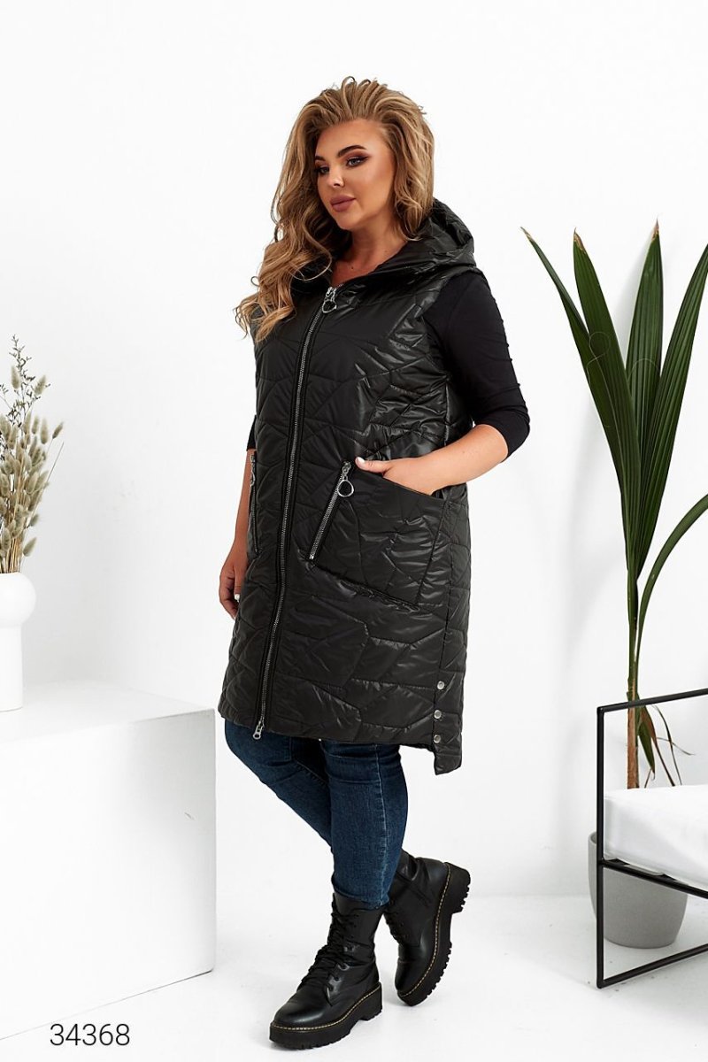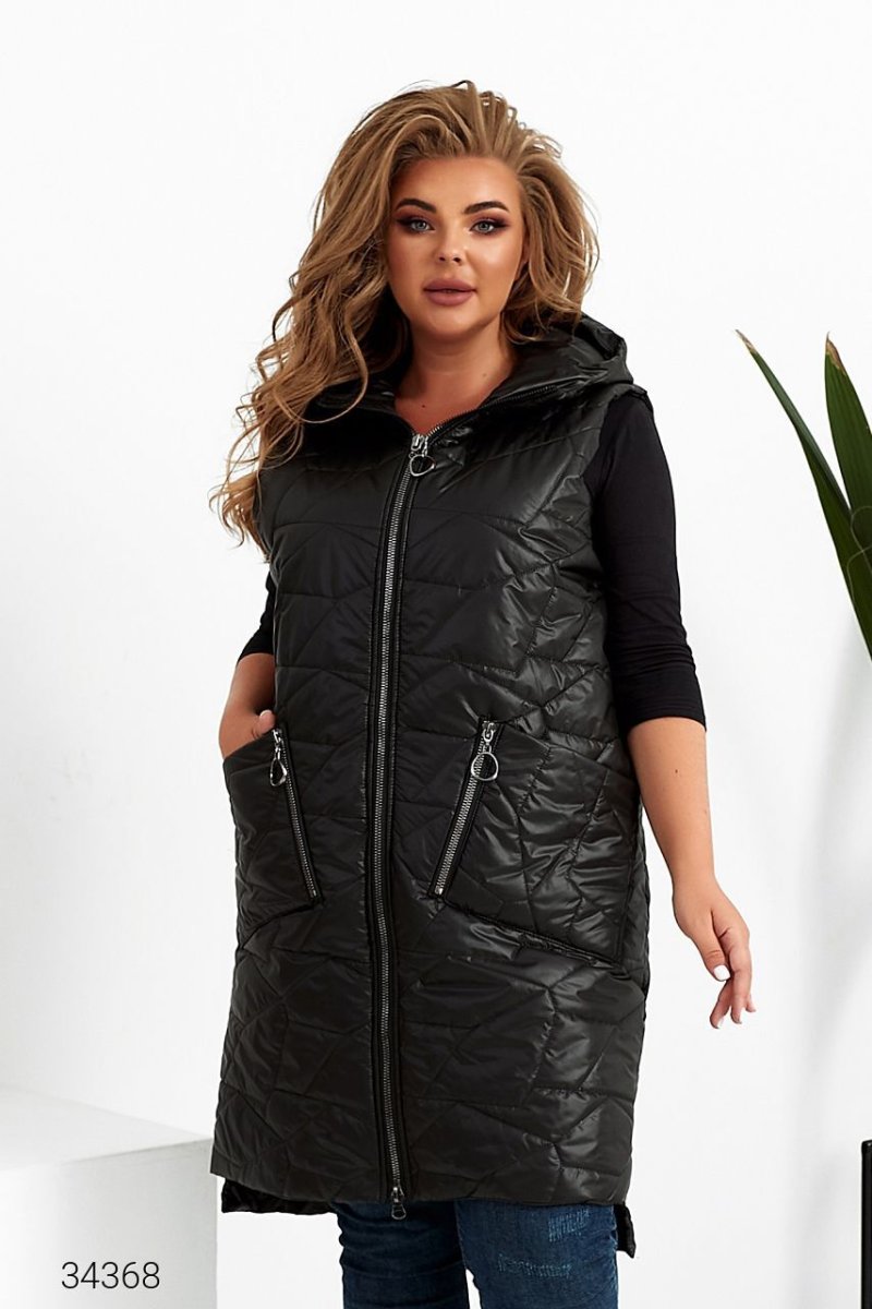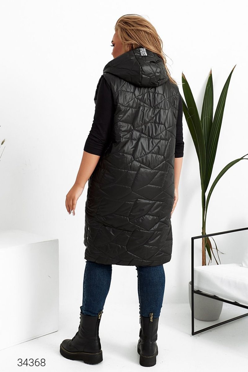 Стеганный дутый жилет из плащёвки на синтепоне. Объёмный капюшон с нашивкой, накладные карманы с декоративными молниями. Асимметричный нижний край с декоративными кнопками по бокам, застёжка на молнию.