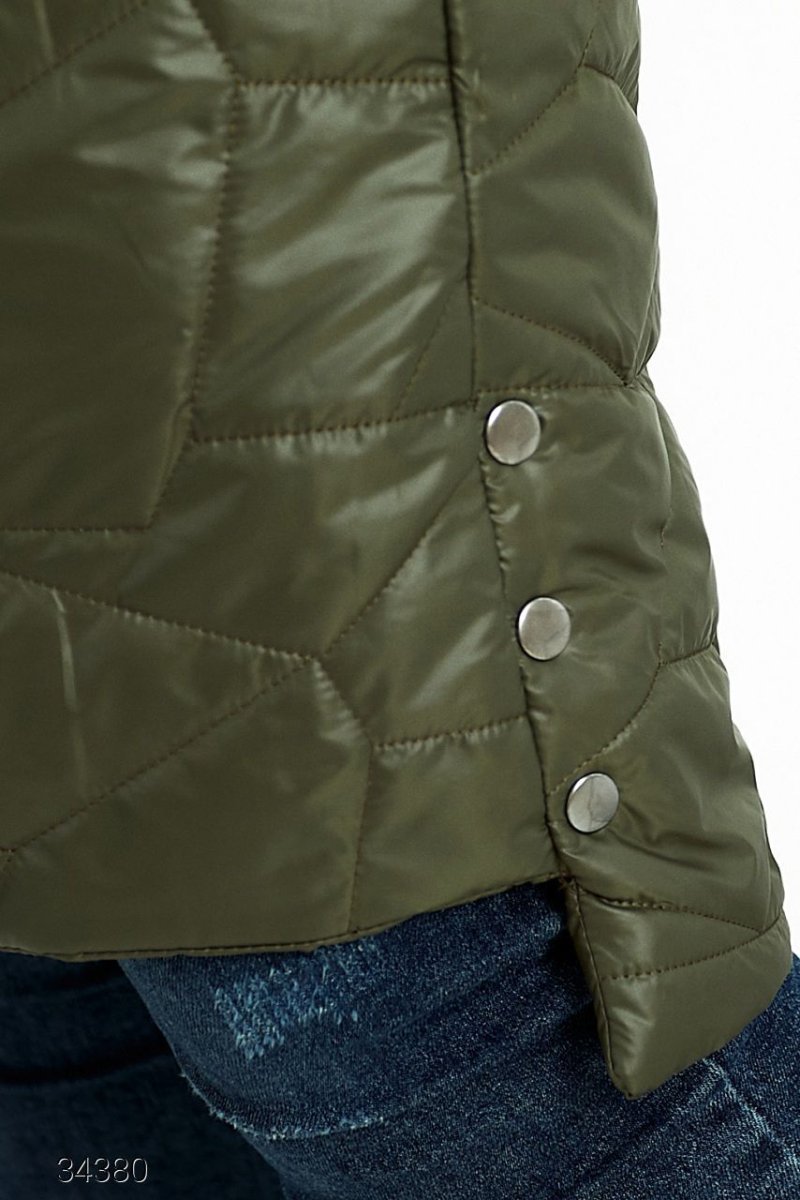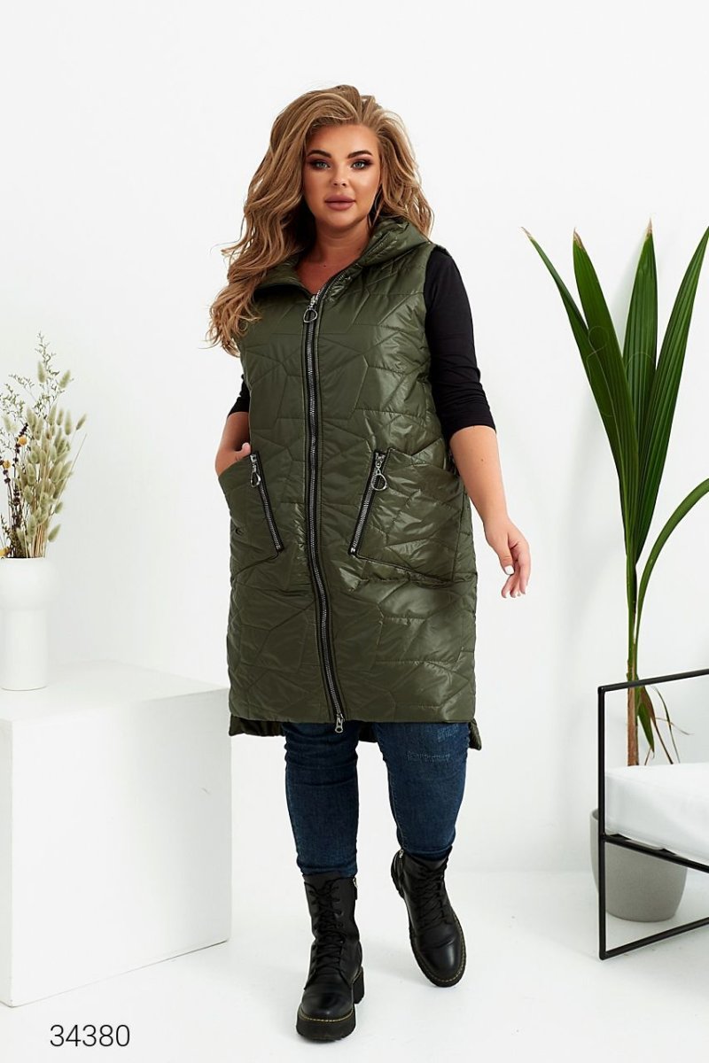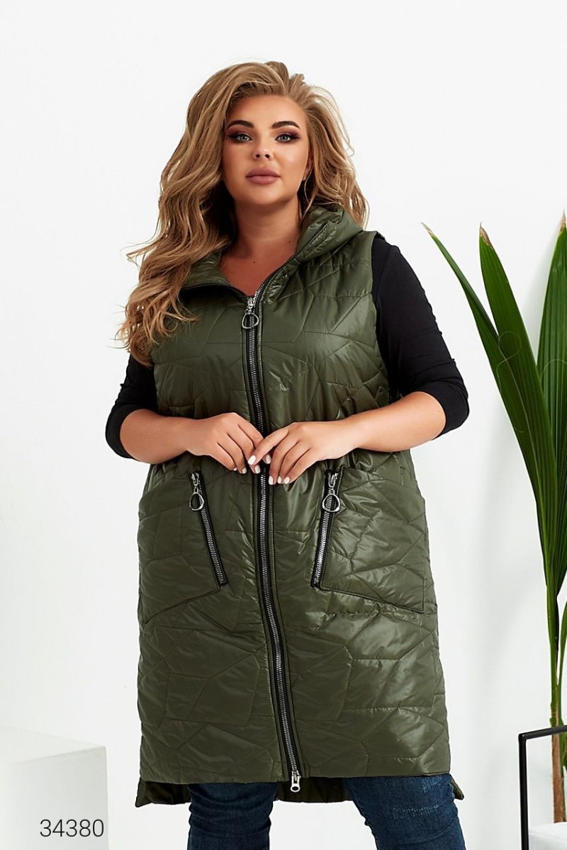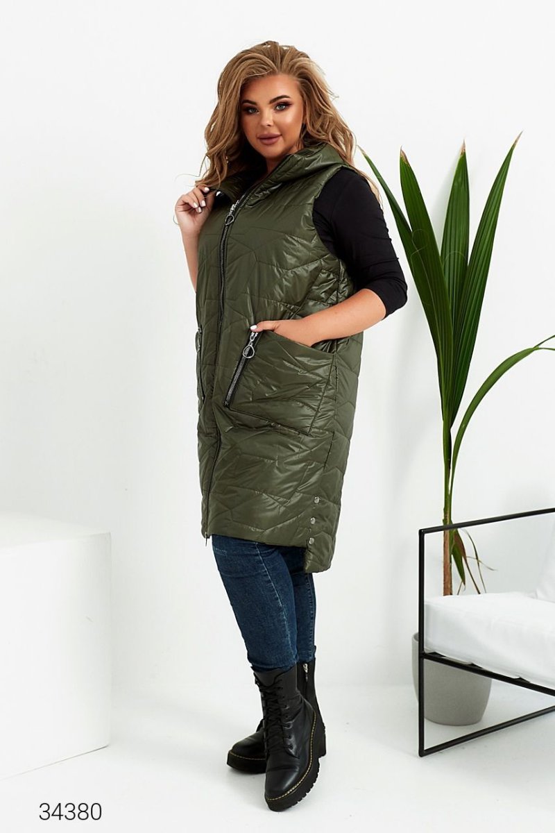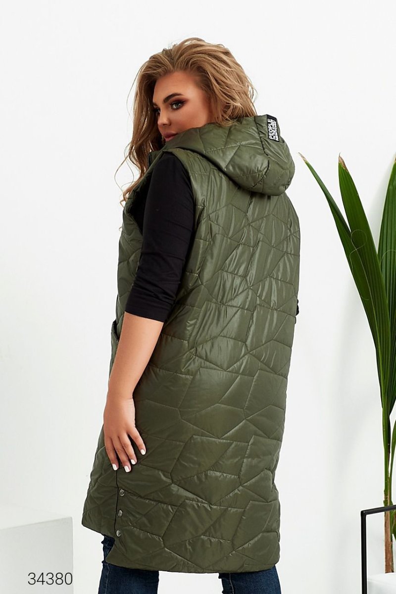 Стеганный дутый жилет из плащёвки на синтепоне. Объёмный капюшон с нашивкой, накладные карманы с декоративными молниями. Асимметричный нижний край с декоративными кнопками по бокам, застёжка на молнию.