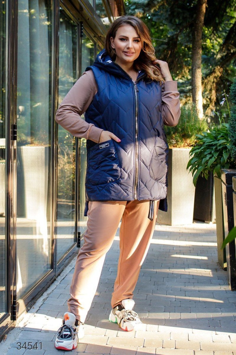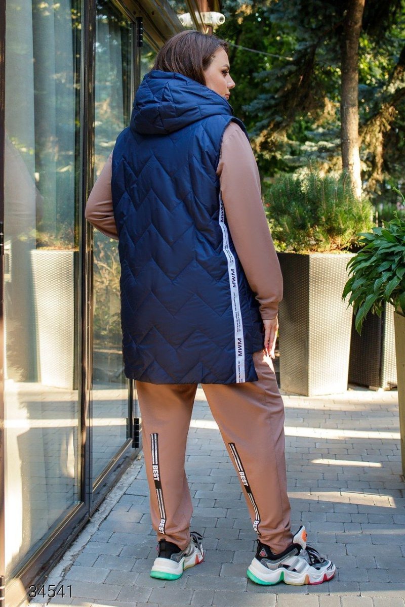 Стеганный дутый жилет из плащёвки на синтепоне. Объёмный капюшон, накладные карманы, нашивка. Асимметричный нижний край с контрастными боковыми лампасами, застёжка на молнию.
