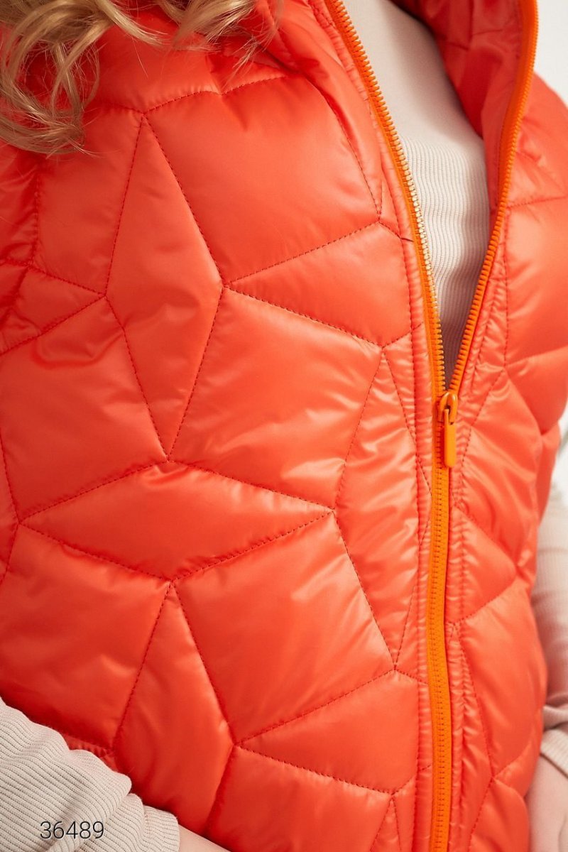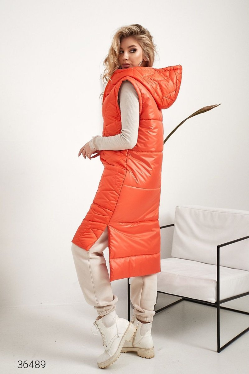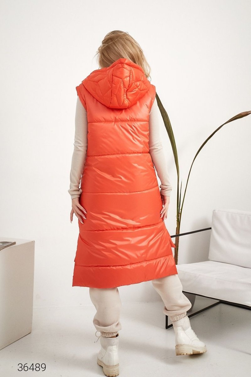 Жилет из качественной плащевой ткани на синтепоне. Объёмный капюшон, боковые накладные карманы, асимметричный нижний край с боковыми разрезами. Есть подкладка с контрастным принтом, застёжка на молнию.