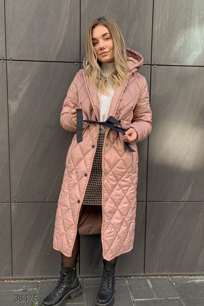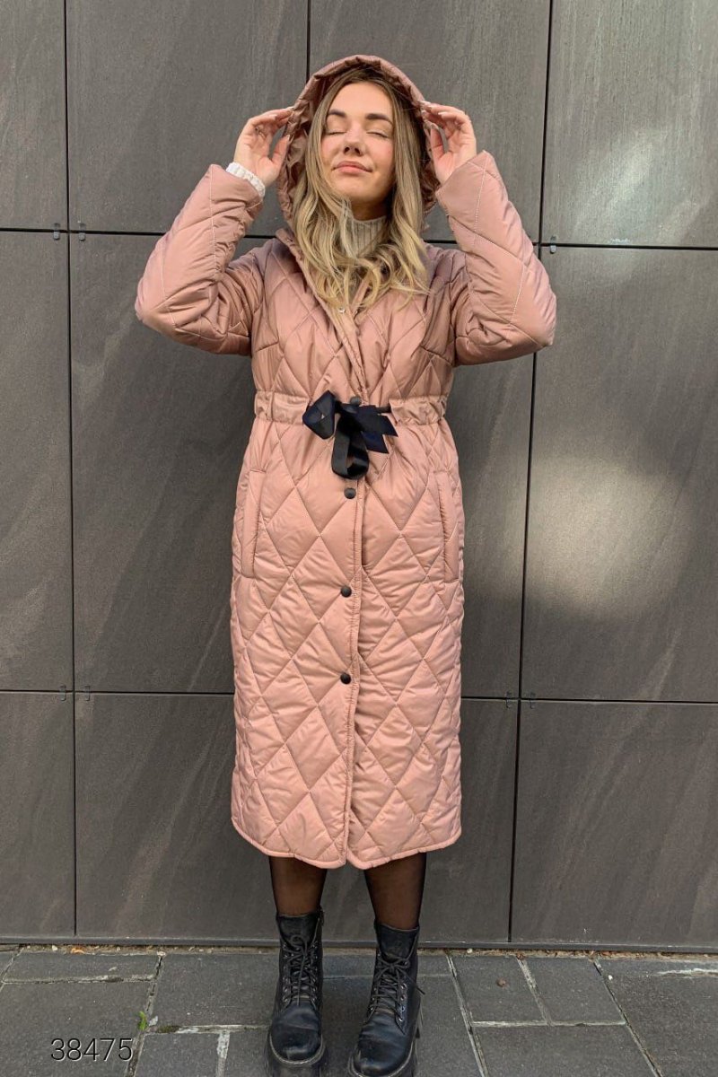 Стёганое пальто с капюшоном. Пальто из стёганной плащёвой ткани на силиконе. Объёмный капюшон, боковые прорезные карманы, затягивающийся шнурок на талии. Есть подкладка, планка на кнопках.