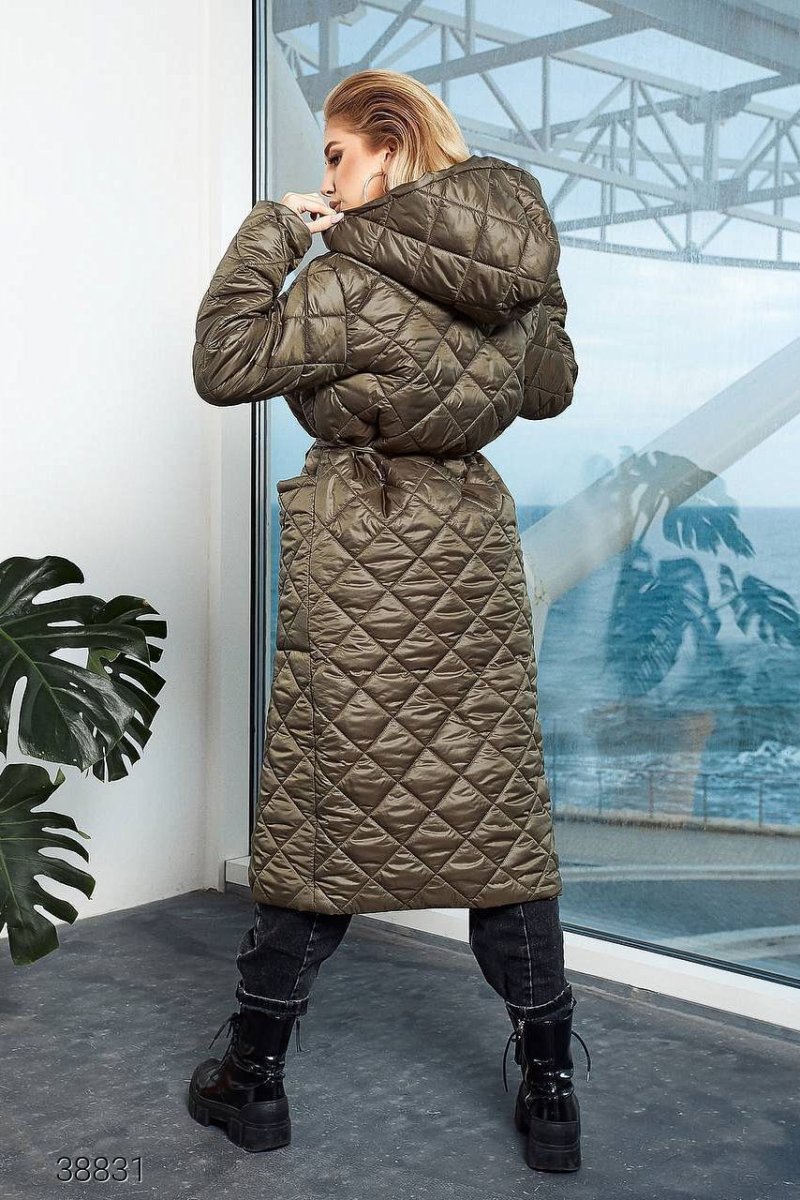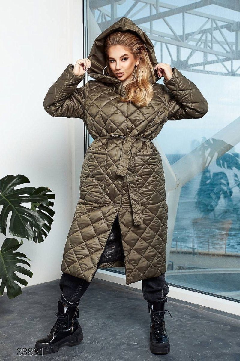 Стёганое пальто миди с капюшоном. Глубокий капюшон, накладные боковые карманы. Есть принтованная подкладка, застегивается на кнопки, пояс в комплекте. Ткань: плащевка стеганая на синтепоне 200 г.м2 с подкладом.