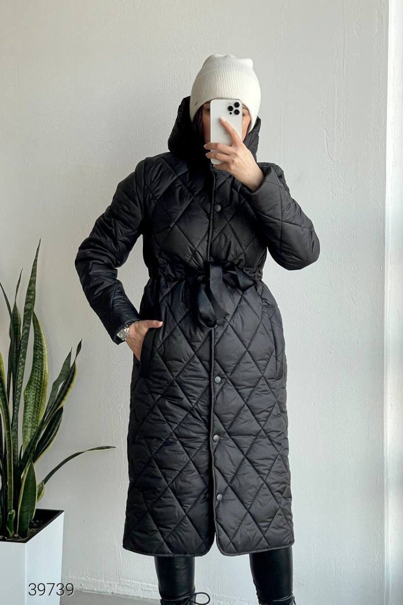 Стёганое пальто с капюшоном. Пальто из стёганной плащёвой ткани на силиконе. Объёмный капюшон, боковые прорезные карманы, затягивающийся шнурок на талии. Есть подкладка, планка на кнопках.