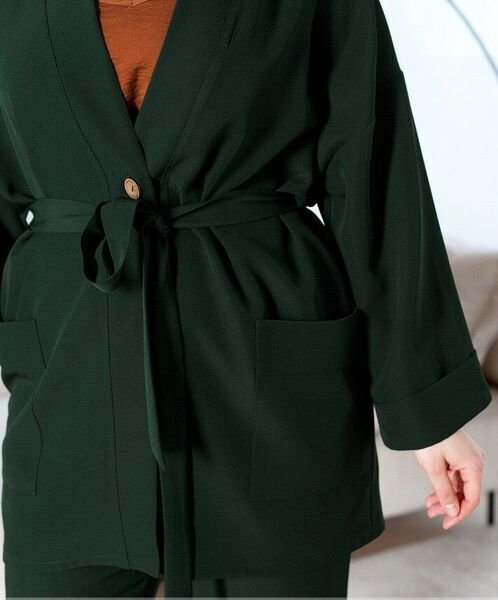 В комплект входят лаконичные классические брюки на резинке с карманами, а также минималистичный жакет свободного кроя с накладными карманами, застегивающийся на одну пуговицу спереди и дополненный широкими рукавами с манжетами. Создайте приталенный образ, подчеркнув силуэт с помощью входящего в комплект текстильного пояса.