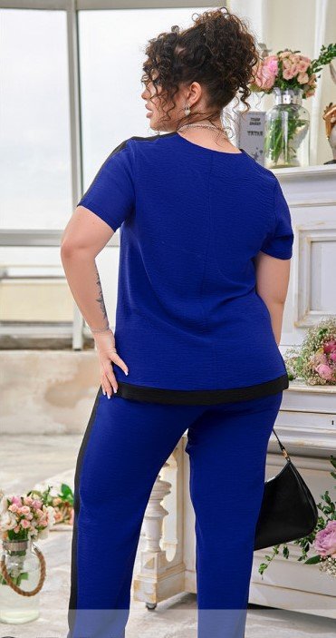 Стильный и очень лёгкий костюм двойка с контрастными вставками. Блуза прямого кроя с горловиной V-формы и окантовкой, которая красиво извлекает силуэт и зрительно делает фигуру более стройной. Разделение полукруглое с кокетливыми разрезами по бокам. Контрастная вставка обрамляет разделение, а также рукава. Брюки прямого кроя на резинке с высокой посадкой и боковыми карманами. По бокам контрастная окантовка. Прекрасный вариант костюма, который должен быть в гардеробе. Идеально подходит под любой случай, в зависимости от обуви и аксессуаров. Дополните костюм обувью на каблуке, серьгах и пиджаком и вы получите отличный образ для кэжуал вечеринки или важной встречи, а добавив спортивную сумку и обувь вы получите готовый образ на пикник с друзьями или прогулки с семьей.