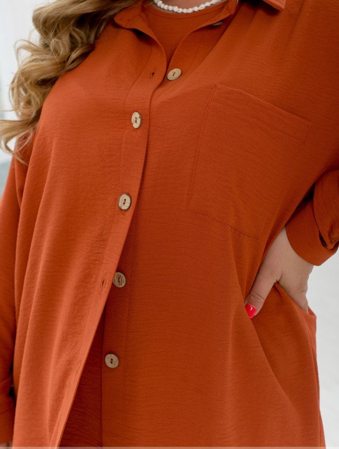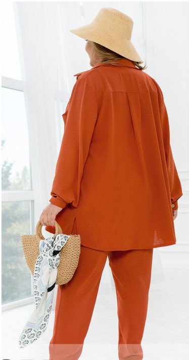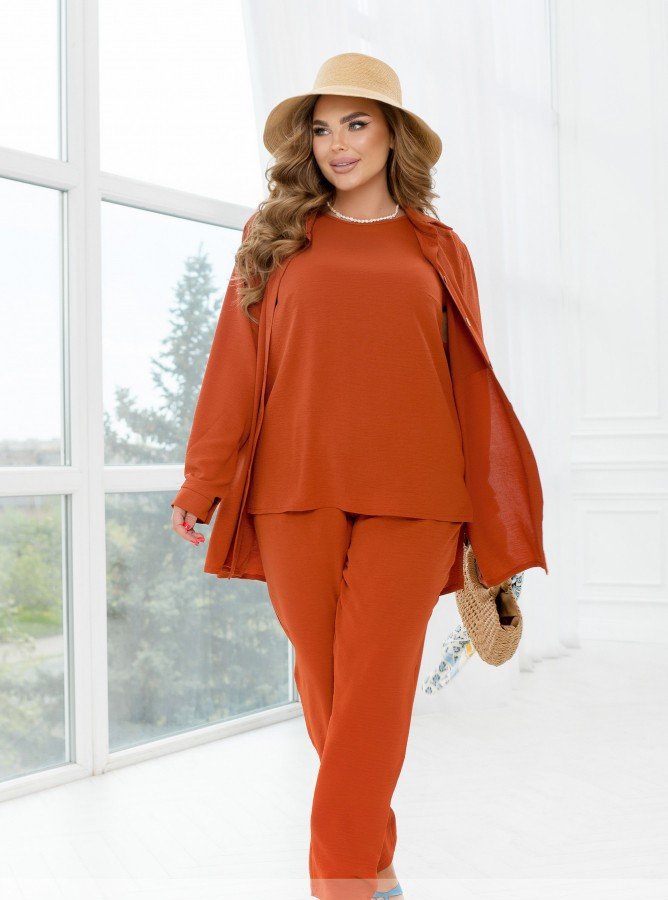 Элегантный и стильный костюм тройки большого размера. Верхняя рубашка удлиненная, с отложным воротничком, на груди накладной карман, по бокам – длинные разрезы. На рукавах манжеты, на манжетах по одной пуговице. Брюки с высокой талией, по бокам - карманы в шве, по пояс вшита резинка. Майка с полукруглым вырезом горловины, на груди вытачки, по бокам подола – разрезы. Без карманов и застежек.