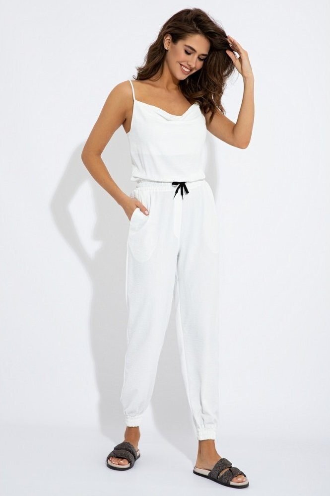Стильный комбинезон на узких регулируемых бретелях. На талии присобран на резинку. В боковых швах - карманы.