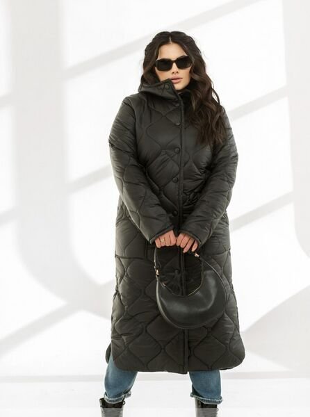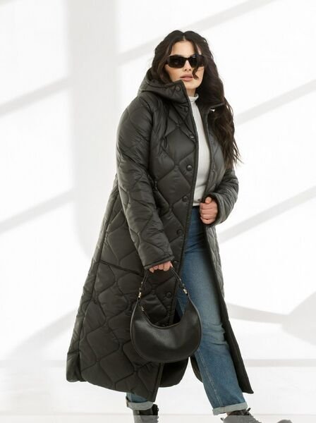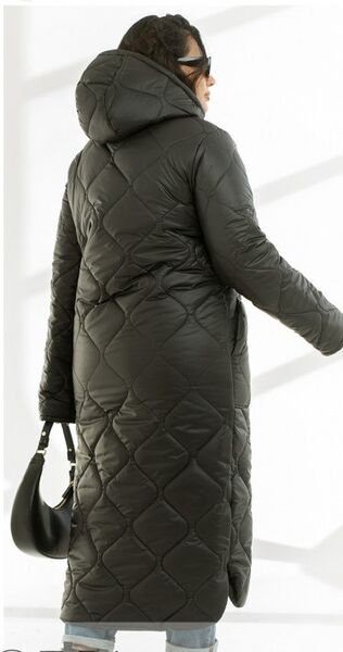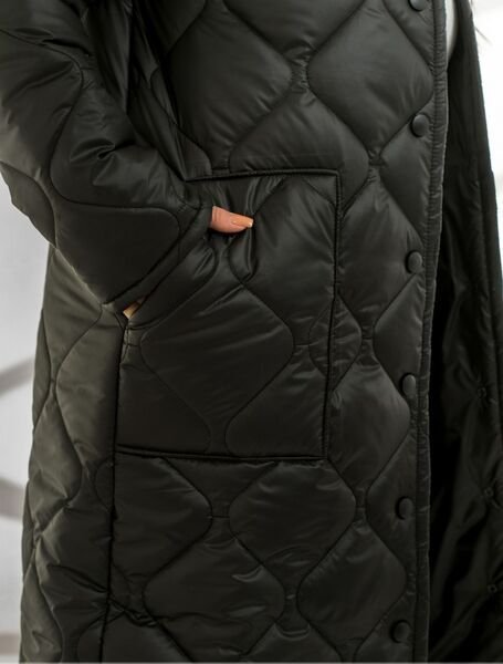 Длинная стеганная куртка с пришивным капюшоном, высоким воротником и длинными рукавами. Такой вариант курток развевается на стильных фэшн показах уже второй год и до сих пор не теряет своей популярности. Куртка застегивается на ряд кнопок спереди.