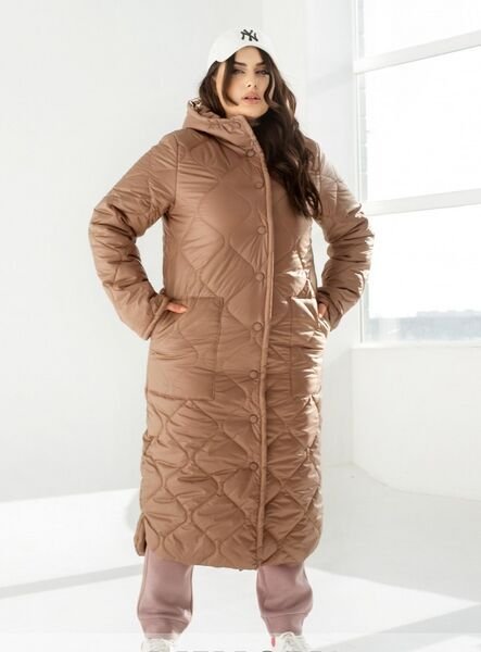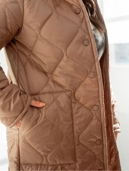 Длинная стеганная куртка с пришивным капюшоном, высоким воротником и длинными рукавами. Такой вариант курток развевается на стильных фэшн показах уже второй год и до сих пор не теряет своей популярности. Куртка застегивается на ряд кнопок спереди.
