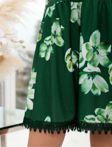 Яркое платье без застежек, которое привлечет Ваше внимание благодаря своей нарядности и ярким принтам. Платье А-силуэта свободного кроя с отрезной линией подола, возле которого размещены карманы, от которых идут оборки на разном уровне.