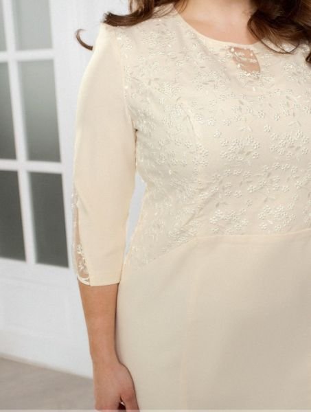 Платье в романтическом стиле хорошо садится по фигуре, вне зависимости от ее особенностей. Эта модель поможет создать нарядный изящный образ для праздников, дружеских встреч и вечеринок. Лиф и спинка модели украшены кружевом в тон основного цвета платья, а рукава 3/4 декорированы кружевными вставками.