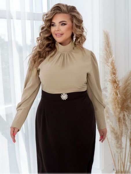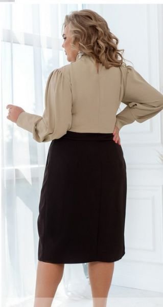 Рукава дополнены высоким манжетом, а также мы собрали ткань на плечевом шве, что придает платью изысканность и нарядность. Изделие застегивается на боковую потайную молнию и на две пуговицы на шее. Прекрасный вариант как для деловой встречи или офиса, так и для важного мероприятия.