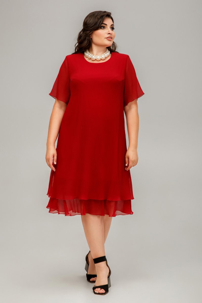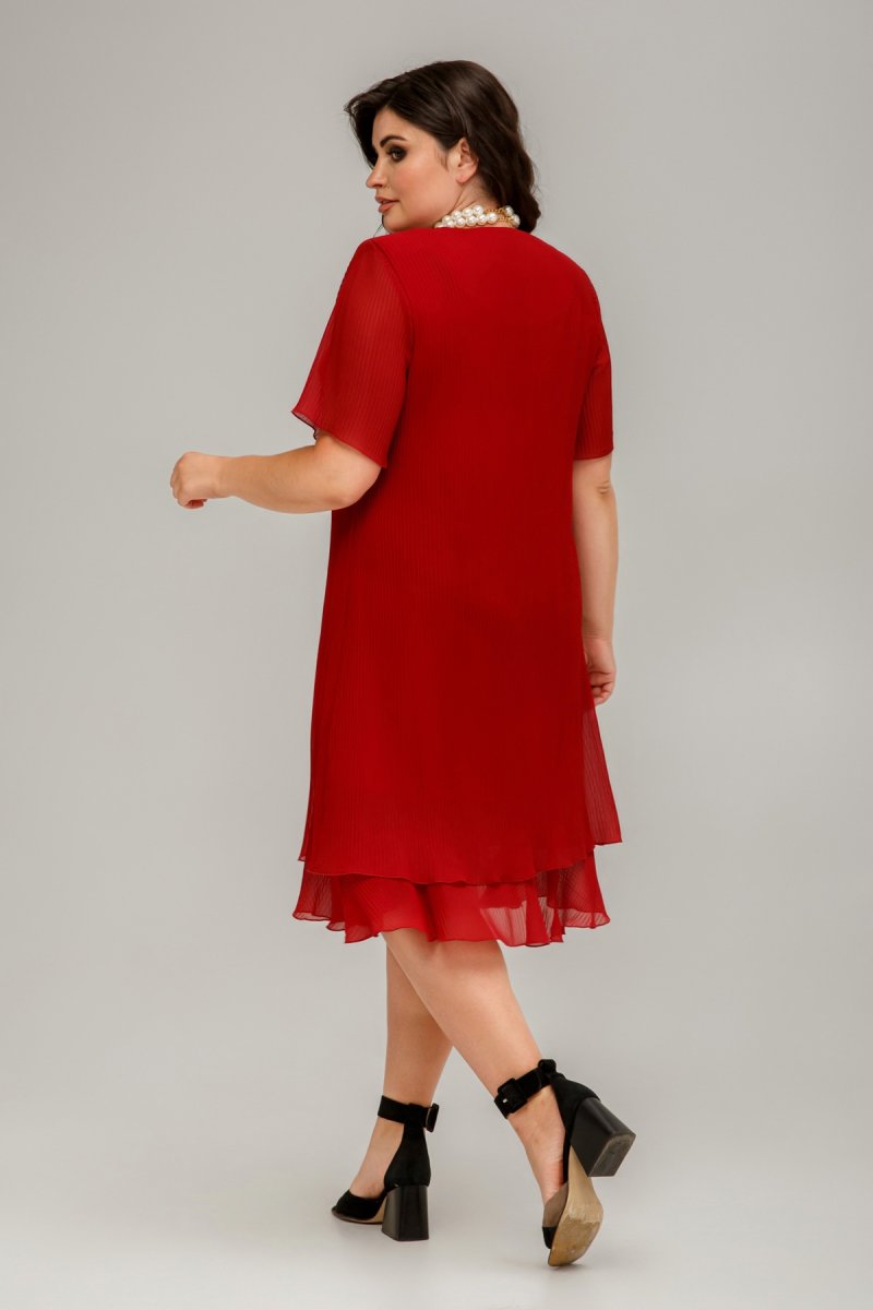 Легкое и свободное платье трапециевидного силуэта. Выполнена из шифона с эластичной трикотажной подкладкой. Рукав втачный, одношовный, расклешенный вниз. Такое же исполнение с воланами выполнено и внизу изделия. Нижний волан приточен к подкладке.
