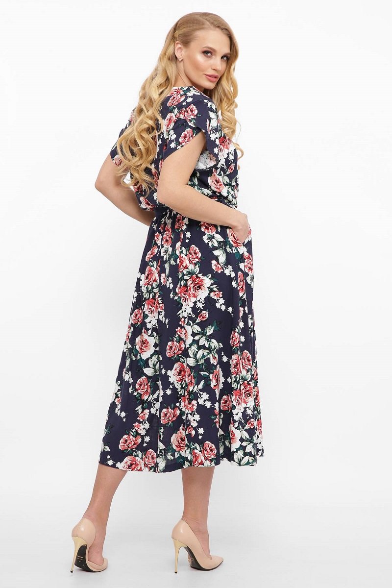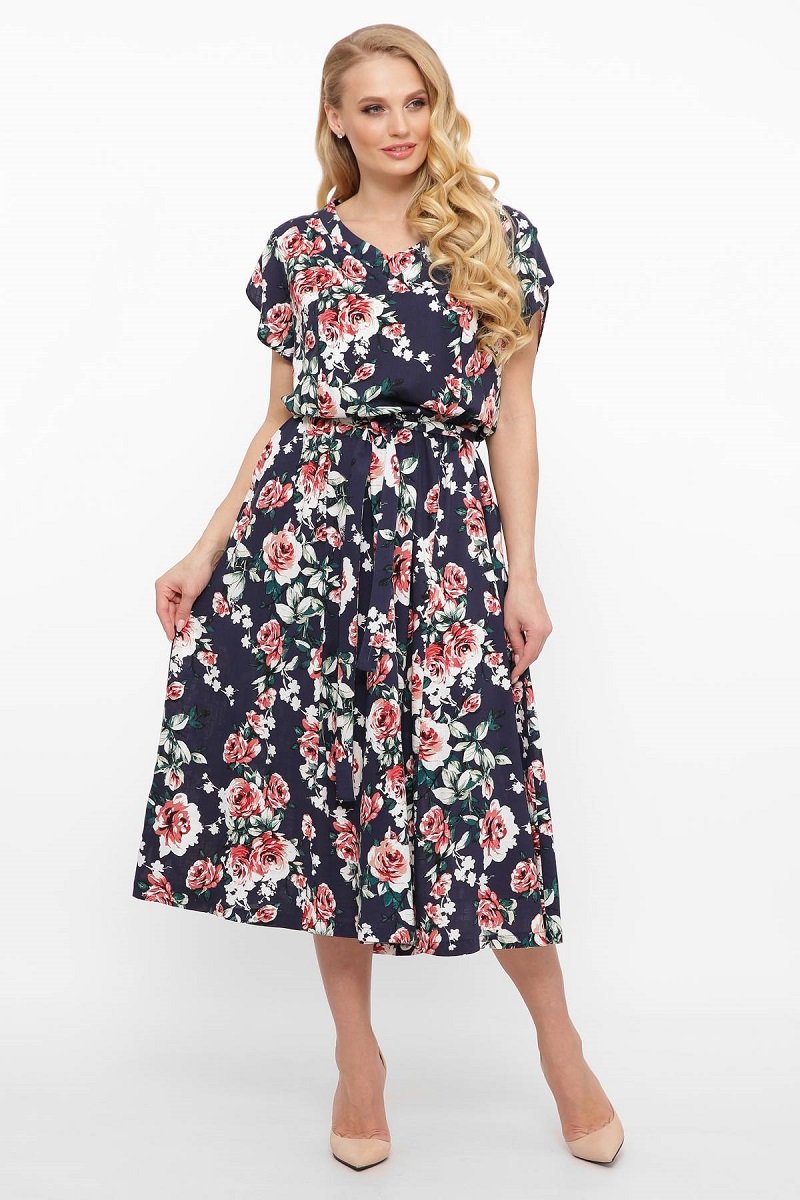 Летнее платье в романтическом стиле из мягкого композитного льна. V-образный неглубокий вырез, укороченный рукав "крылышко" внахлест. Юбка – расклешенная донизу, с красивой сборкой на талии под резинку. Пояс из основной ткани. Красивый цветочный принт.