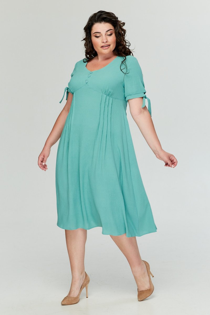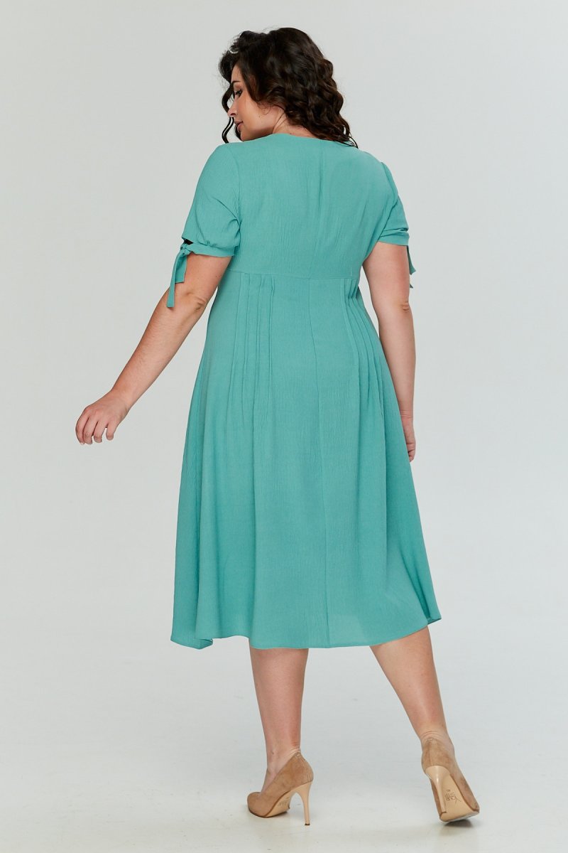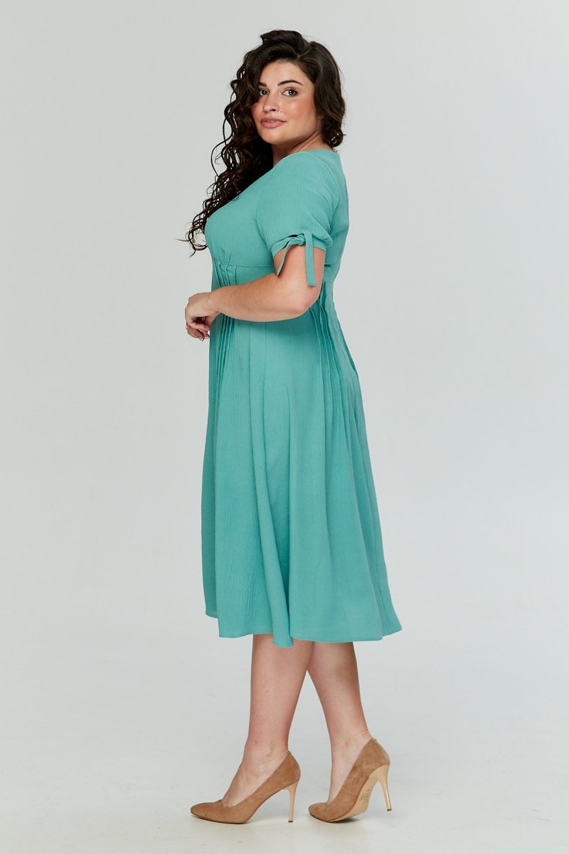 Хорошее, удачно подобраное платье обеспечит вам хорошее настроение. Изделие из американского крепа с V-образным вырезом горловины. Лиф переда прибран на уровне груди. По шву приточки нижней части выполнены составы. Рукав короткий на манжете с завязками.