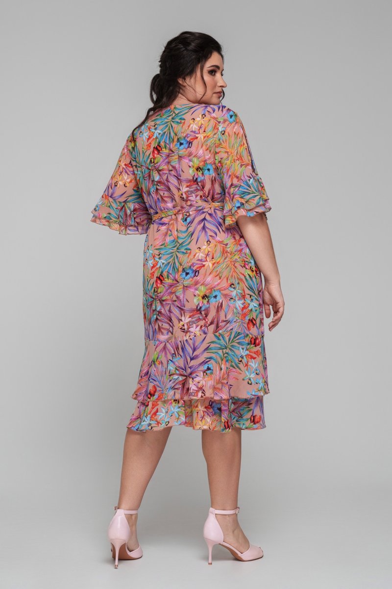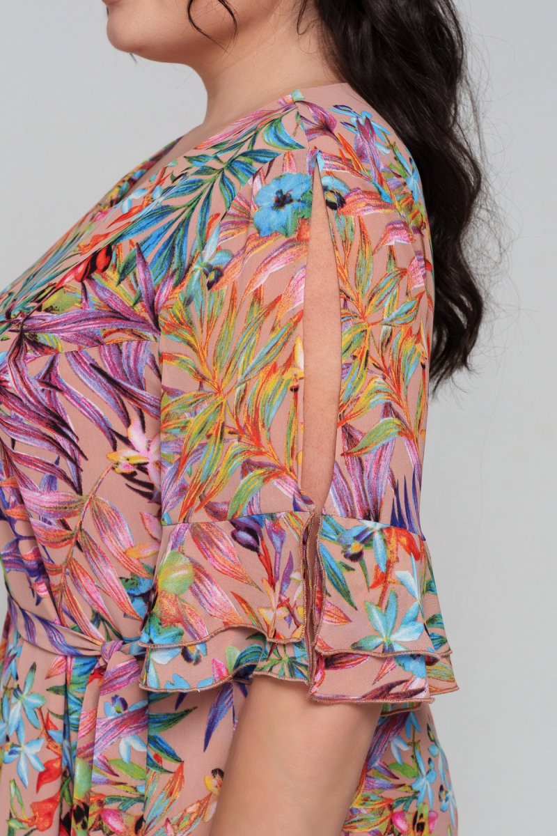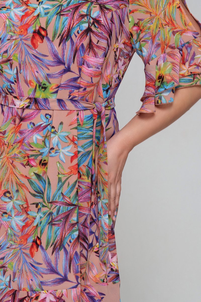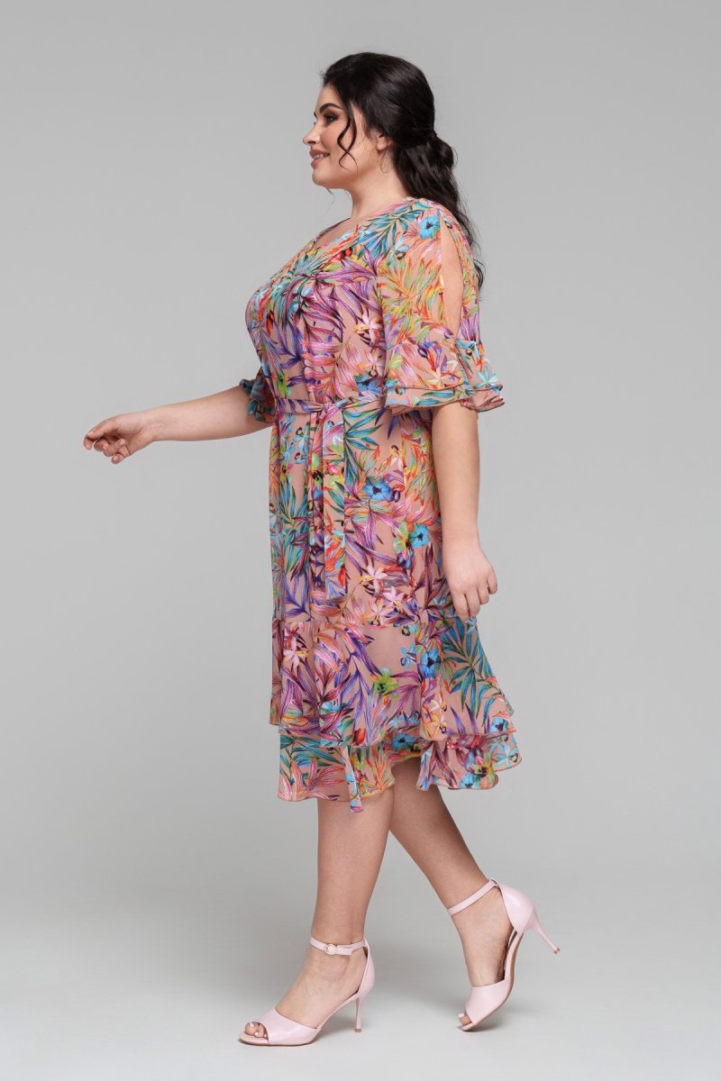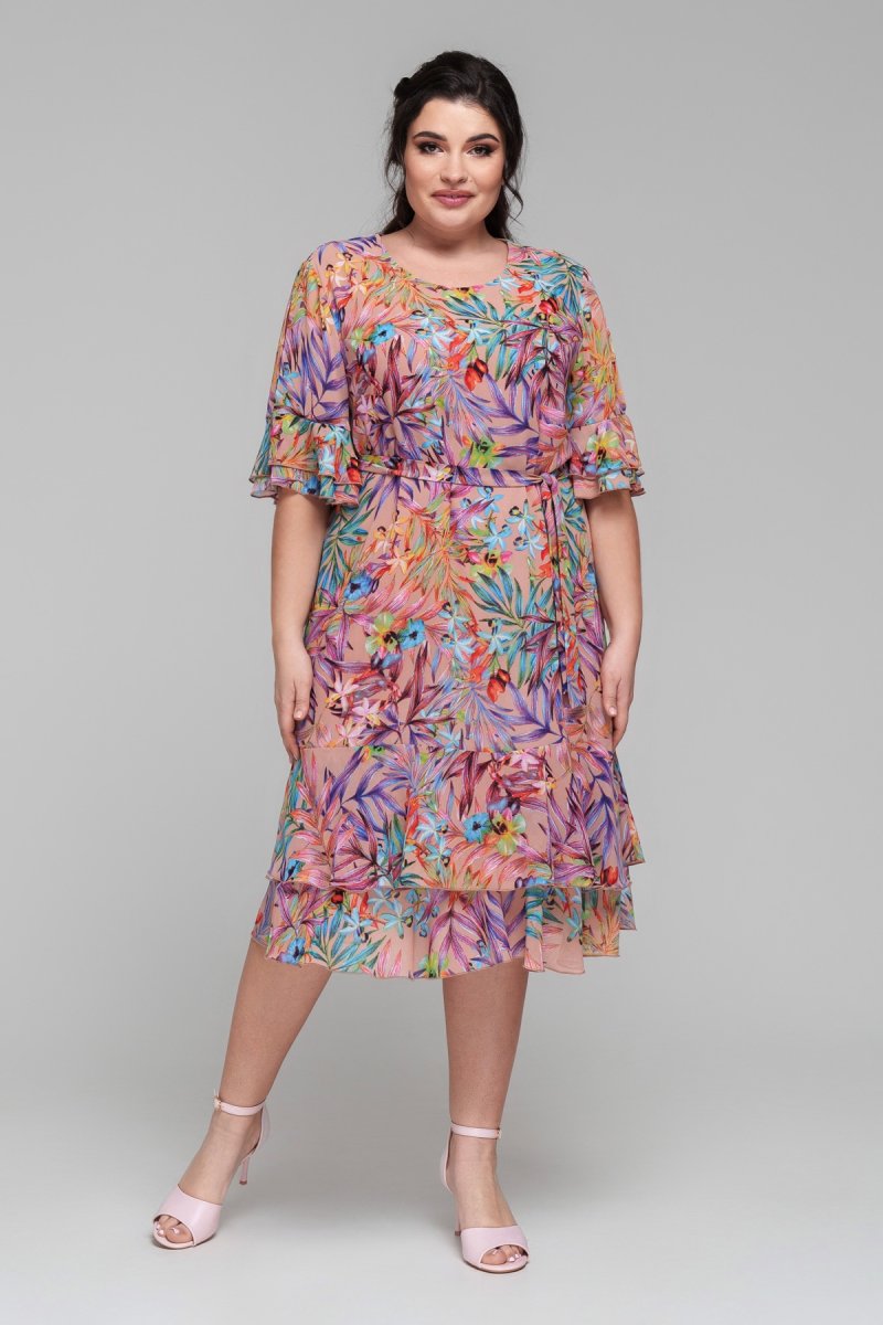 Легкое и свободное платье прямого силуэта. Выполнена из шифона с эластичной трикотажной подкладкой. Рукав втачный с двойным воланом и разрезом. Такое же исполнение с воланами выполнено и внизу изделия. Пояс из той же ткани в комплекте.