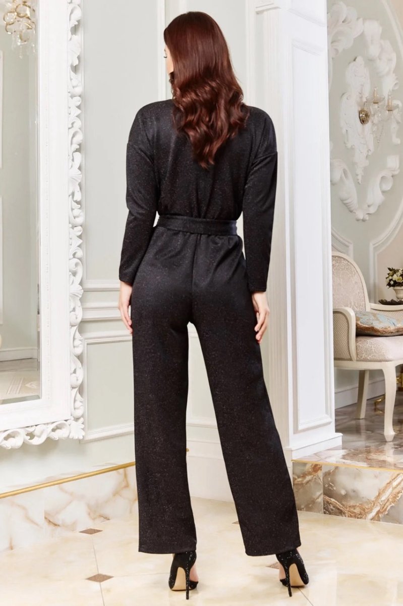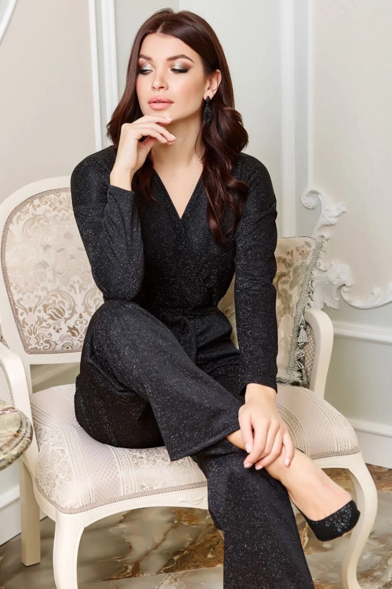 Свободный комбинезон на запах имеет широкие брюки и высокую талию. В комплекте идет съемный пояс. V-образный вырез придает женственности. Принтованный трикотаж нежно переливается на свету.