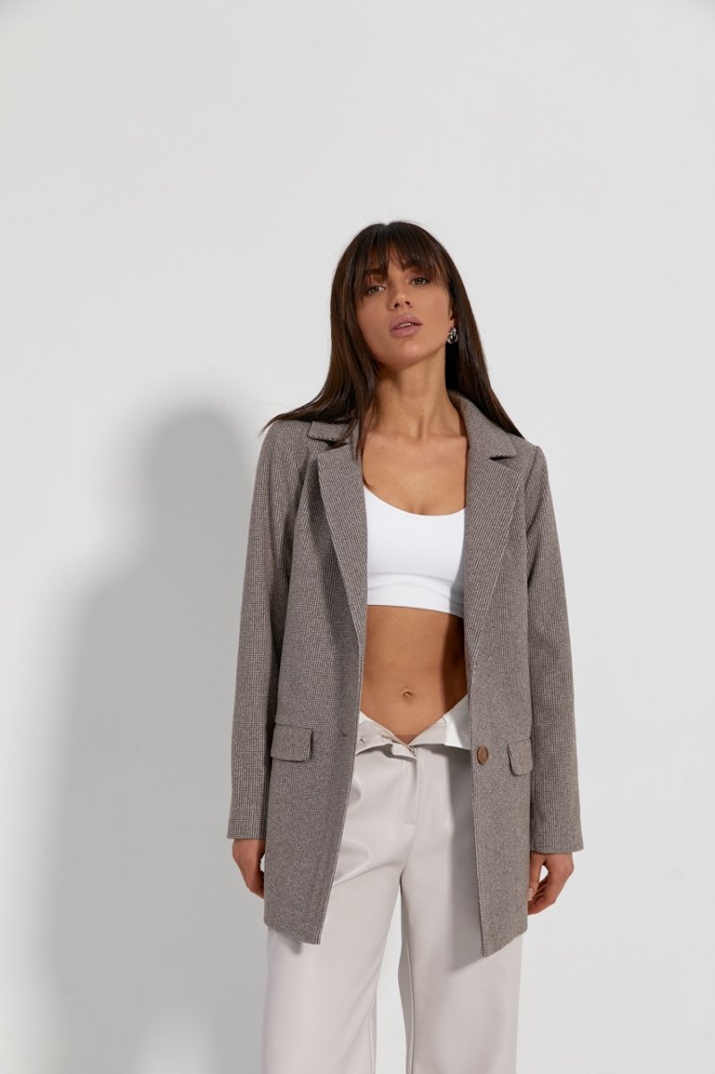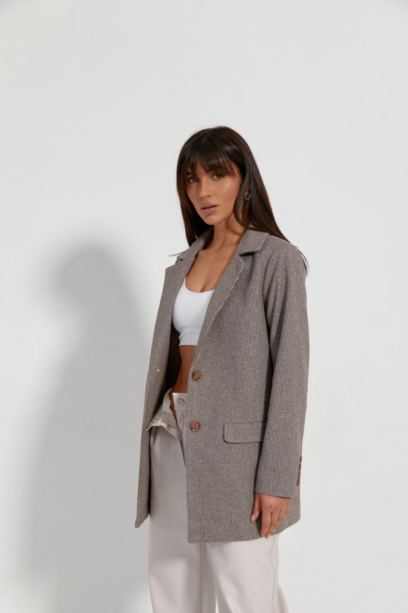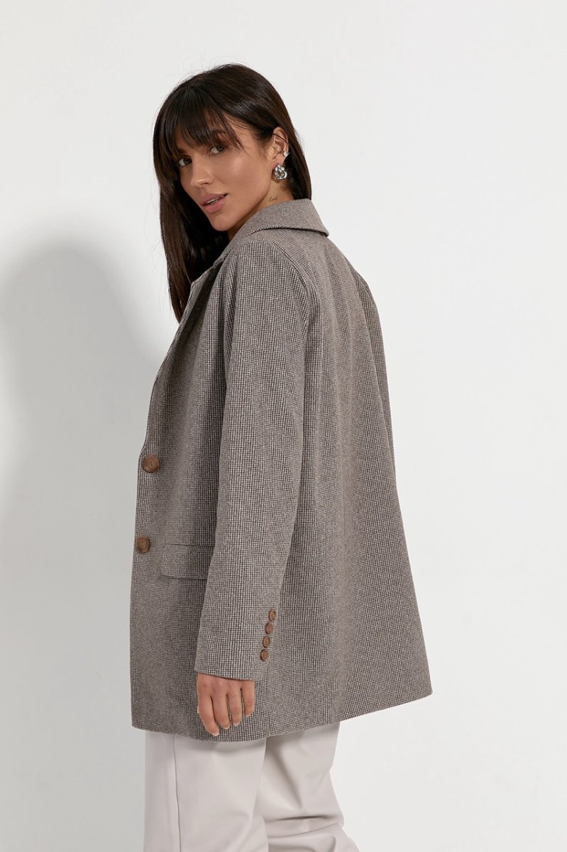 Свободный пиджак на подкладке. Воротник пиджачного типа. Рукава вшивные, длинные, двухшовные с декоративными шлицами и пуговицами внизу. Карманы прорезные с клапанами. Застежка: пуговицы.