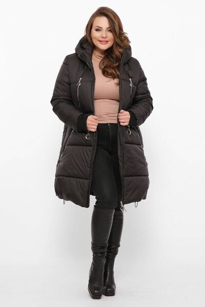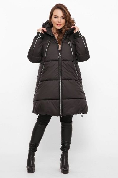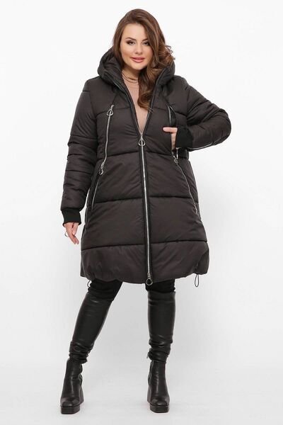 Дутое теплое пальто А-образного силуэта с капюшоном. Застёгивается на молнию. У рельефа переда вшиты вертикальные карманы, которые также застегиваются на молнии.