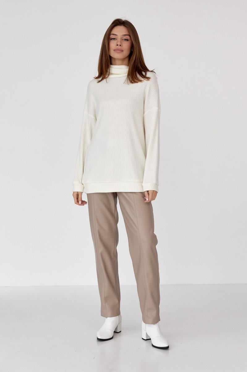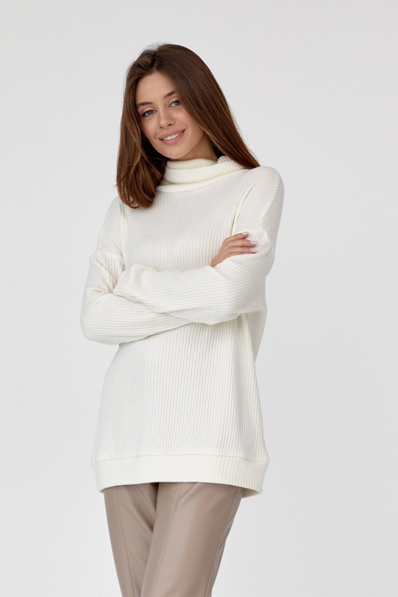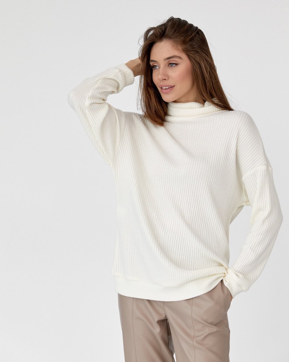 Теплый трикотажный свитер с воротником хомут. Вырез горловины круглый. Уровень плеча приспущен, рукава втачные, длинные. По низу рукавов и изделия выполнен манжет.