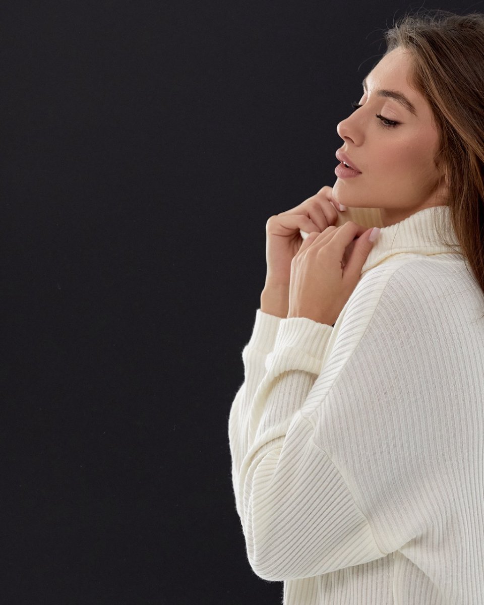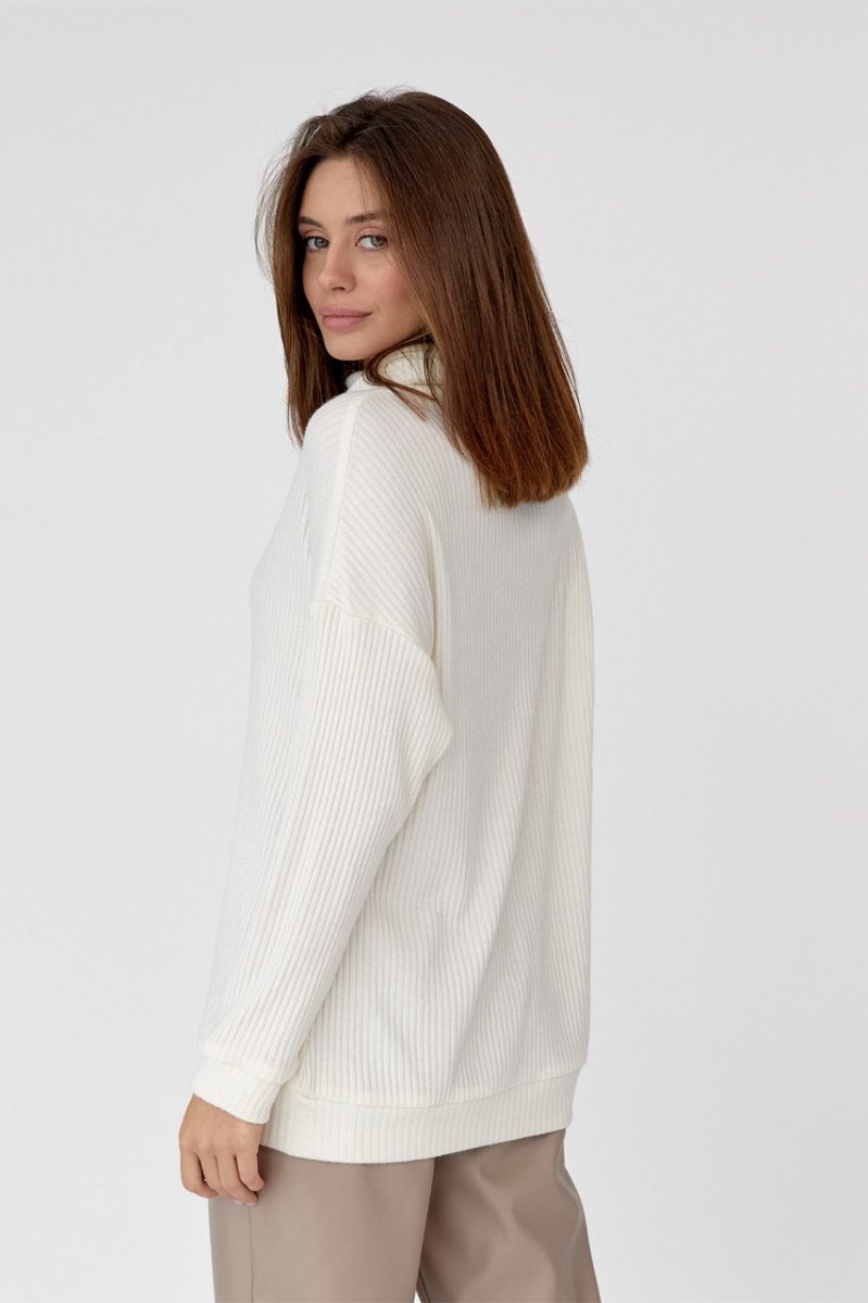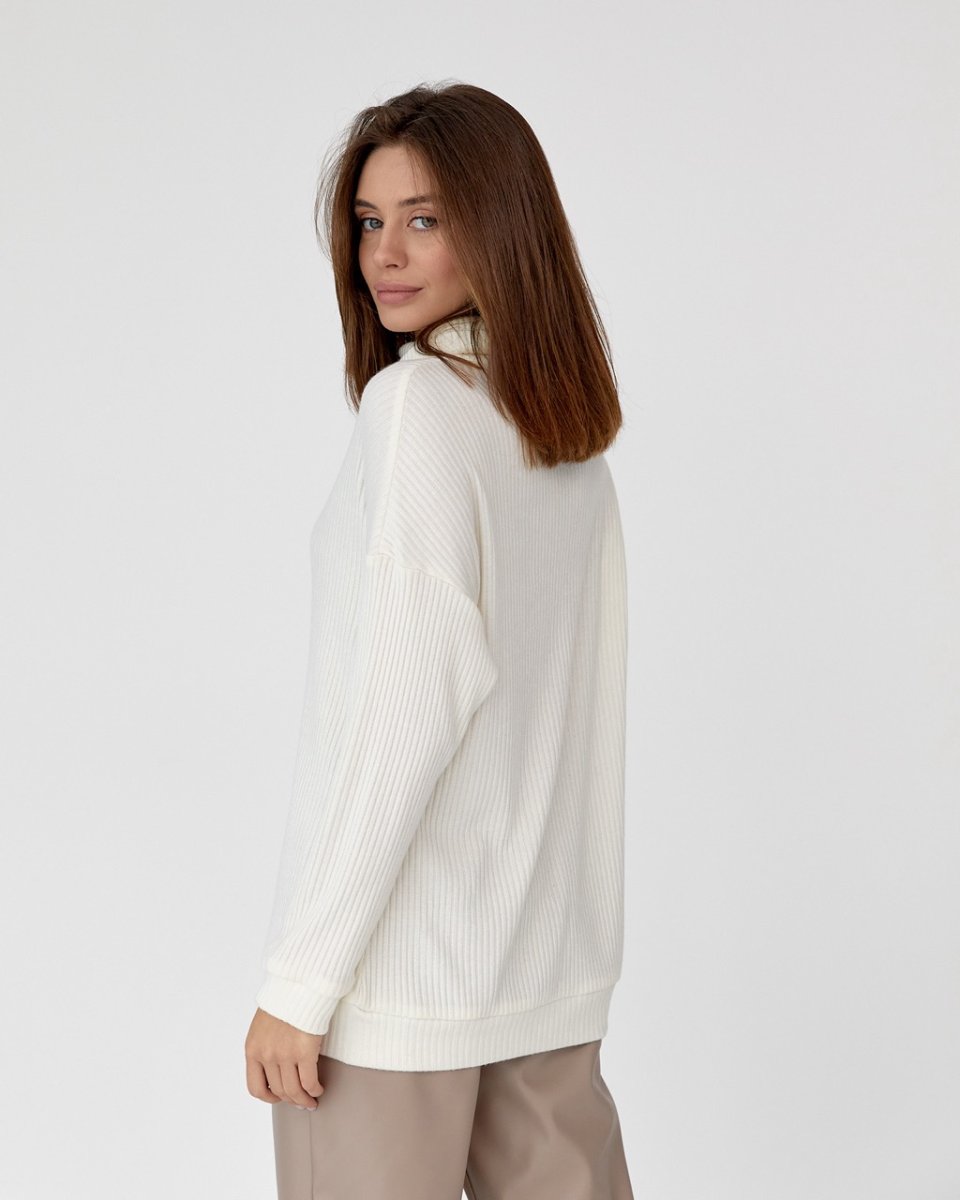 Теплый трикотажный свитер с воротником хомут. Вырез горловины круглый. Уровень плеча приспущен, рукава втачные, длинные. По низу рукавов и изделия выполнен манжет.