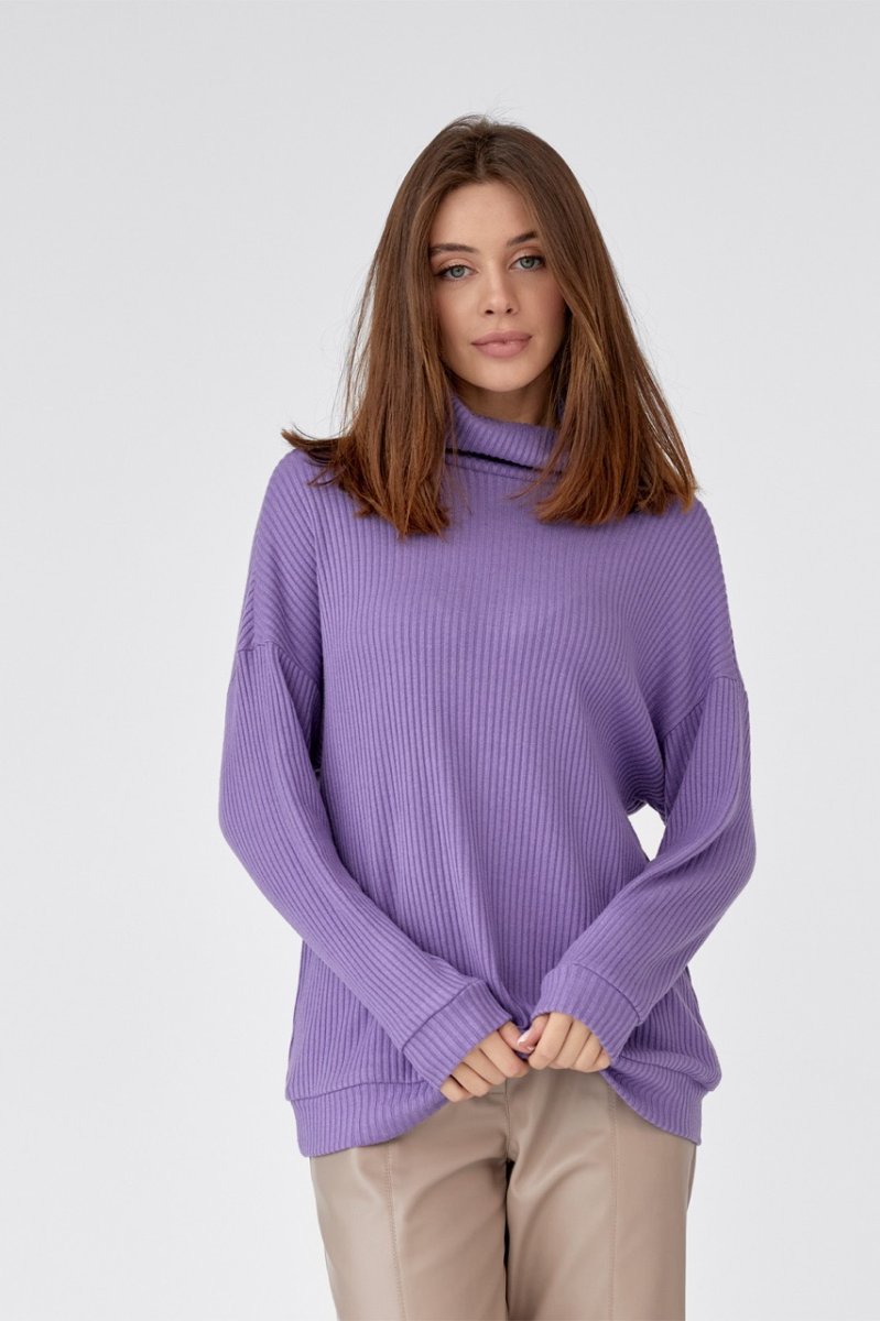 Теплый трикотажный свитер с воротником хомут. Вырез горловины круглый. Уровень плеча приспущен, рукава втачные, длинные. По низу рукавов и изделия выполнен манжет.