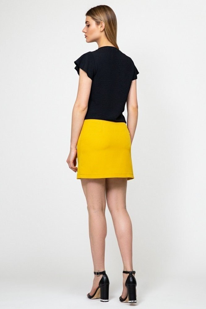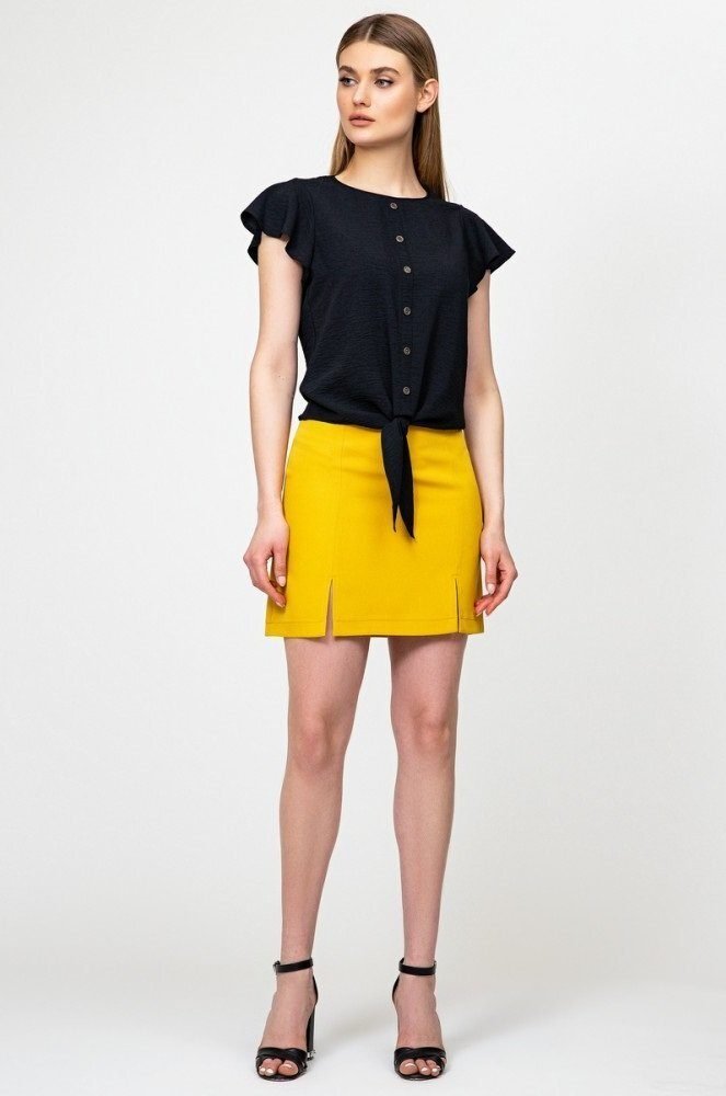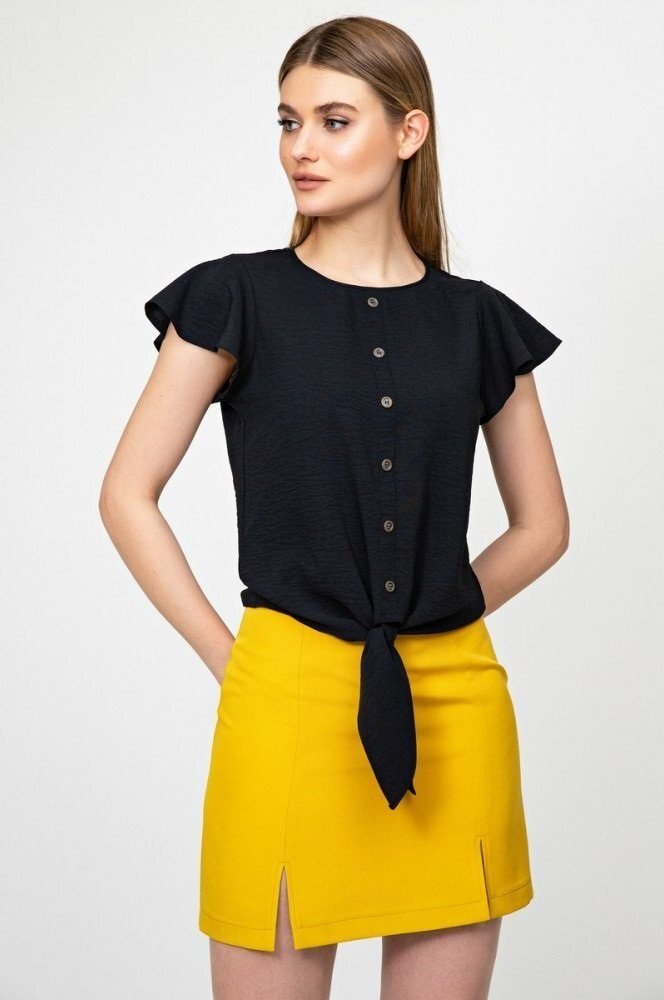 Летний топ из крэш-льна с декором из пуговиц и завязками на талии.