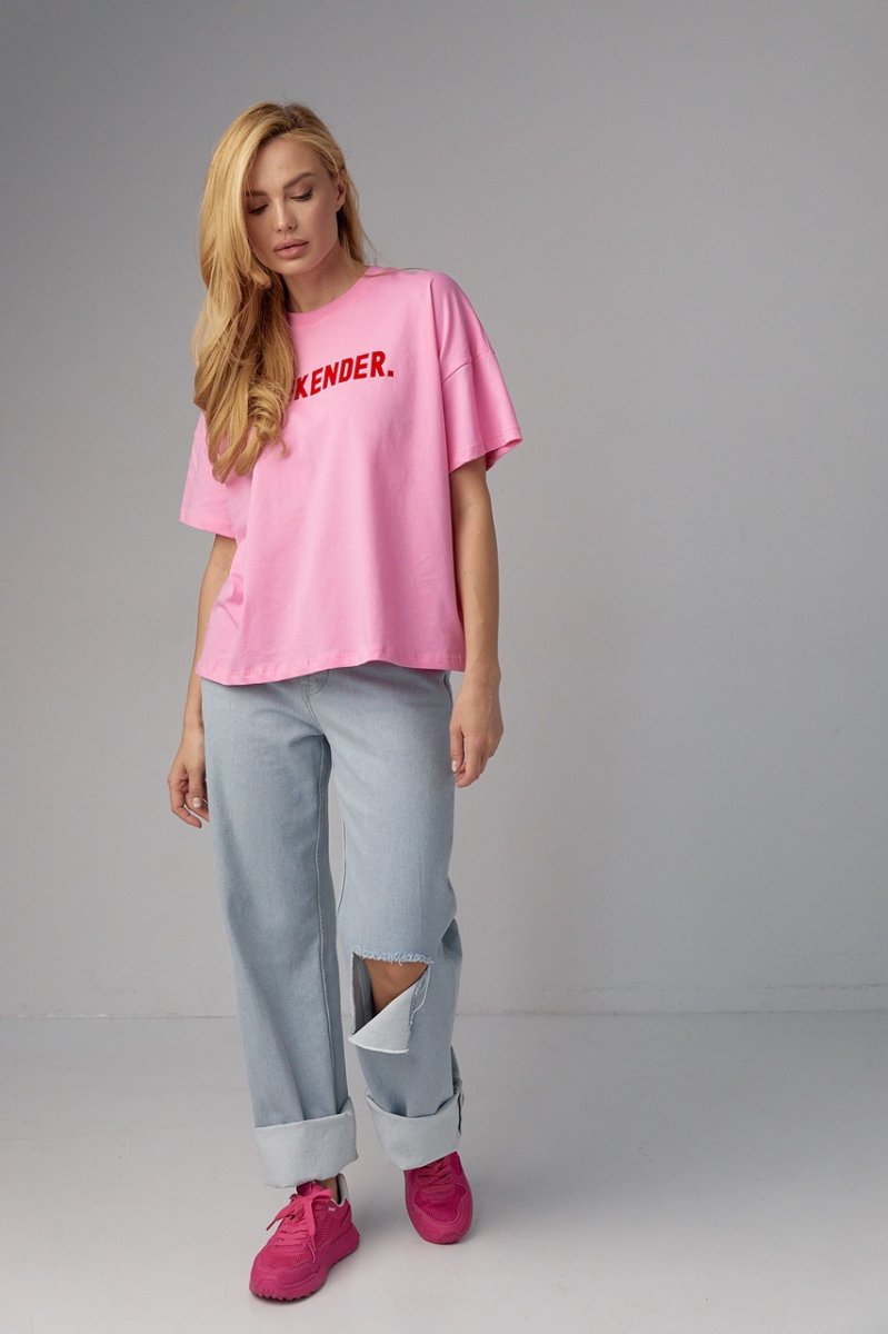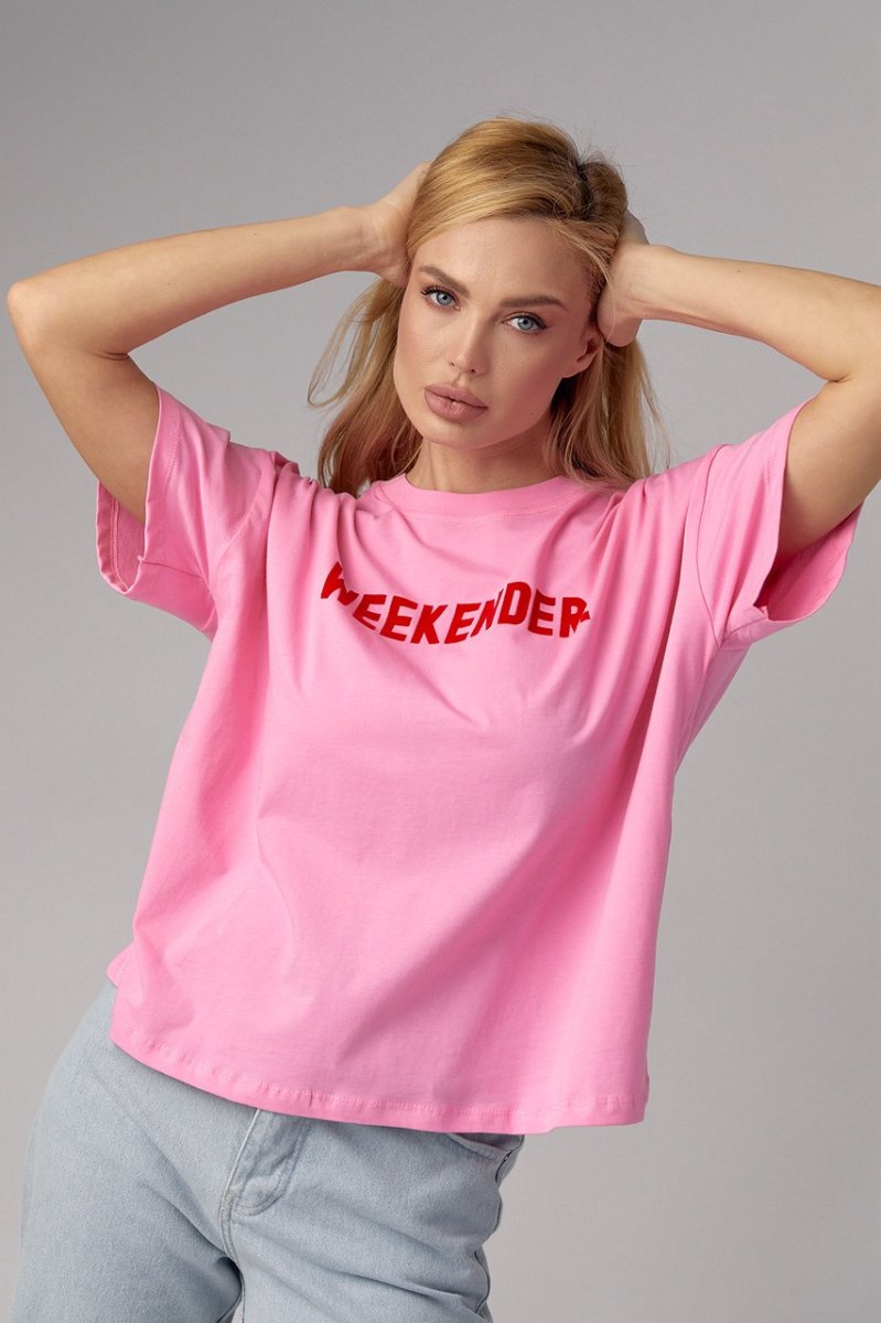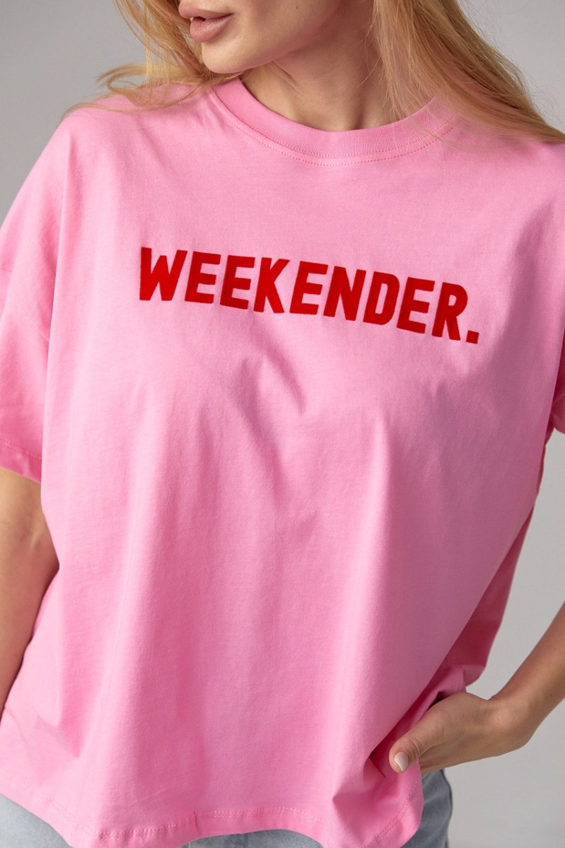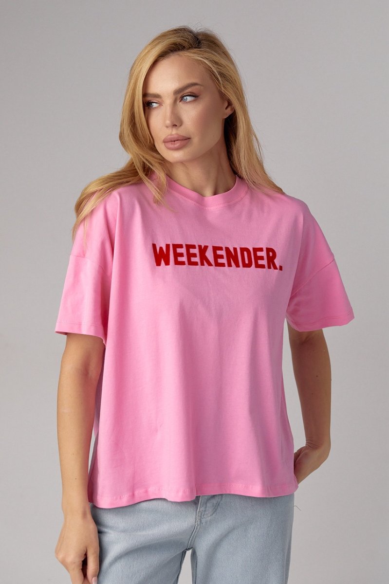 Женская трикотажная футболка прямого кроя с надписью "Weekender" – это модный и удобный элемент гардероба для создания стильных образов.