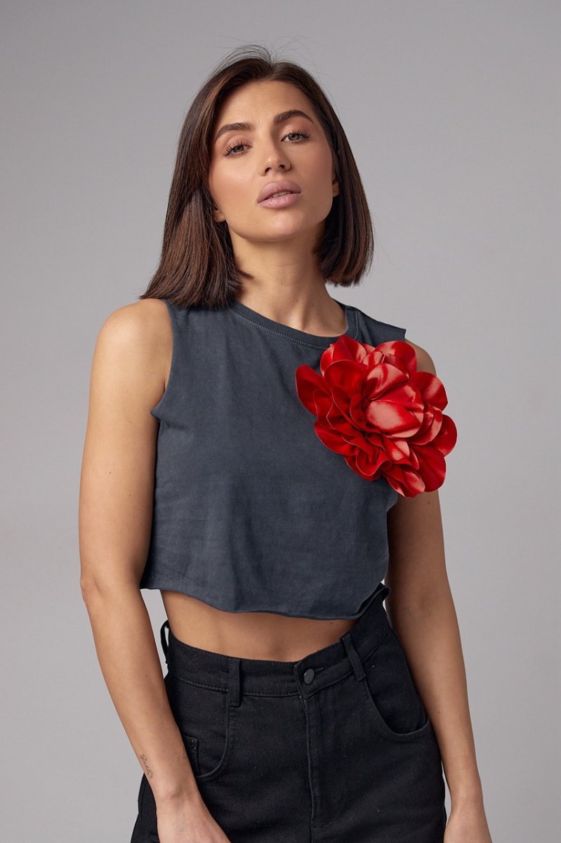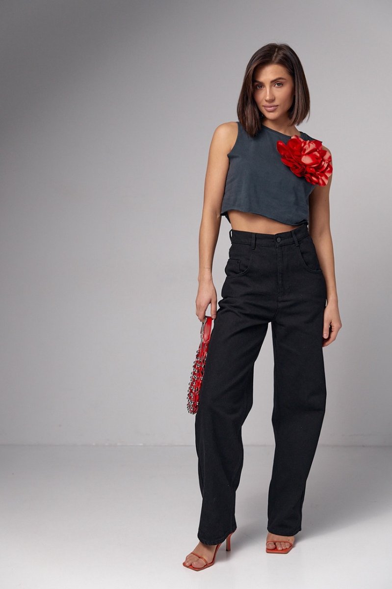 Эта майка прямого кроя из трикотажного материала - прекрасное сочетание комфорта и стиля. На передней части слева расположен объемный цветок, который придает изделию изысканность и уникальность.