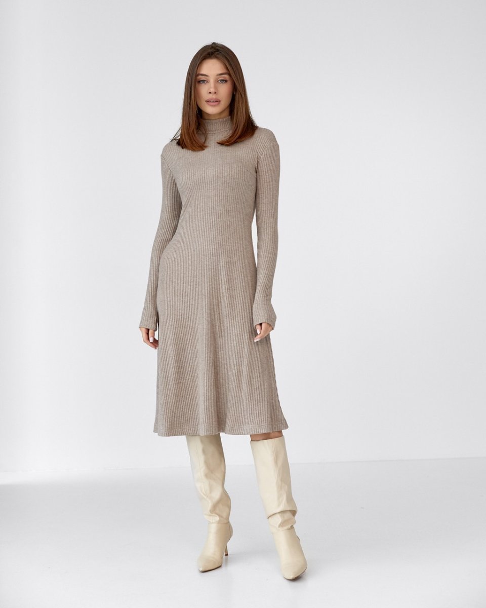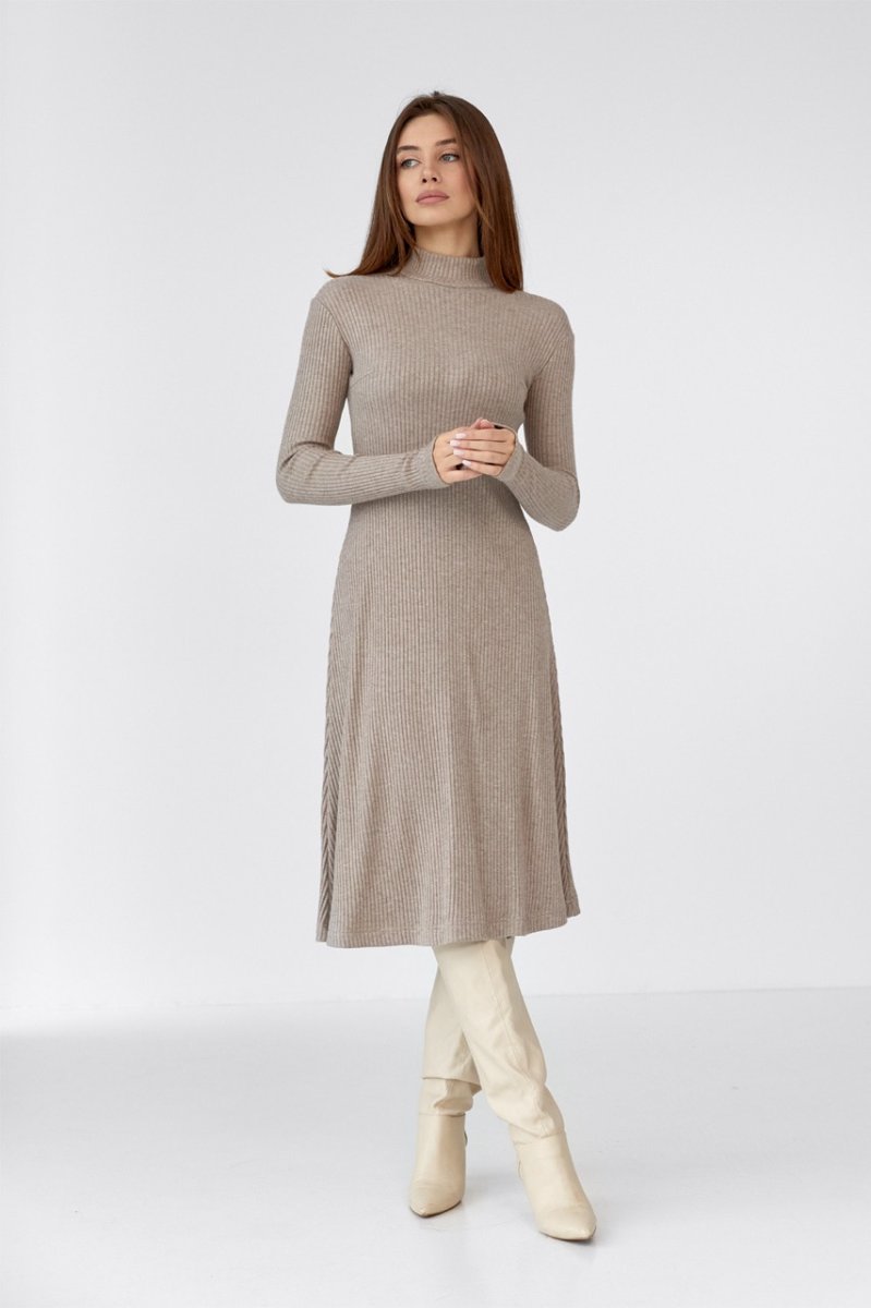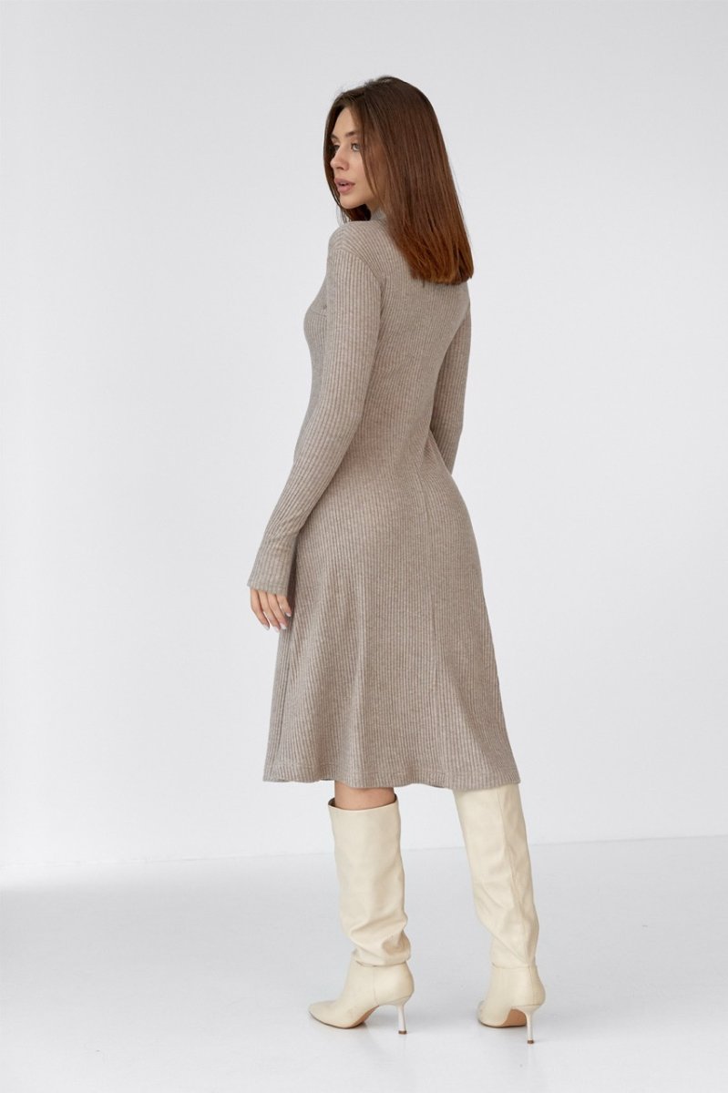 Трикотажное приталенное платье миди, расклешенное внизу. Полочка выполнена с нагрудными выточками. Рукава вточные, удлиненные, с отверстием для большого пальца. Воротник стойка. Спинка со средним швом.
