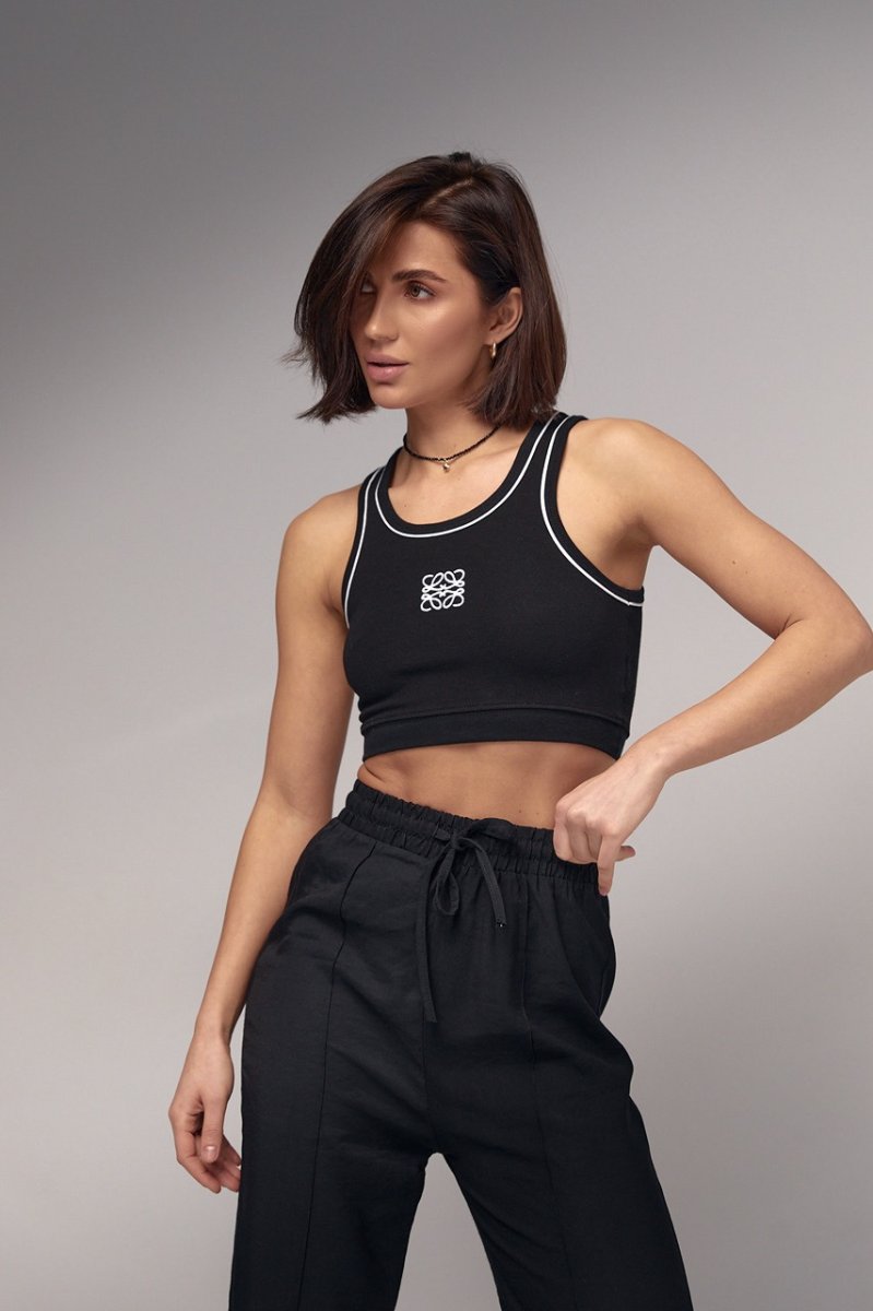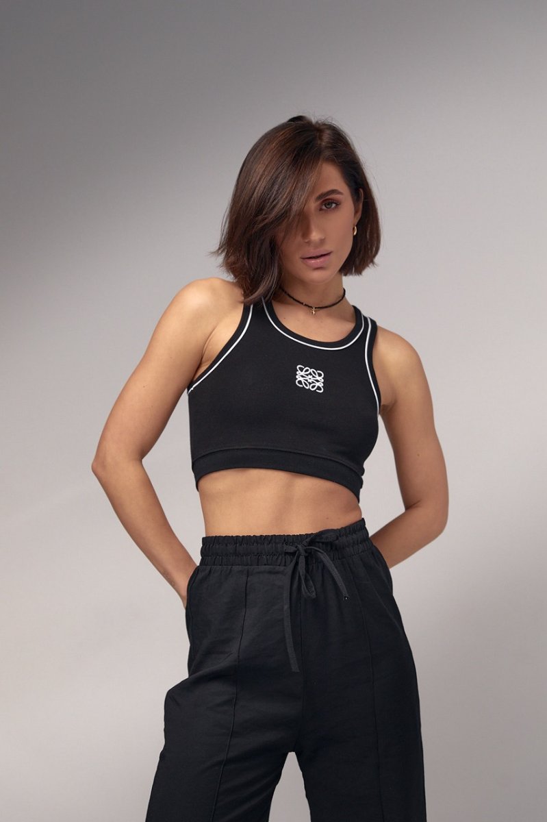 Эта укороченная женская майка идет с прямым низом, который заканчивается двойным манжетом из основной ткани. Проймы и края закругленной горловины обшиты окантовкой с тонкой полоской контрастного цвета. На полочке есть лаконичная вышивка в технике гладь.
