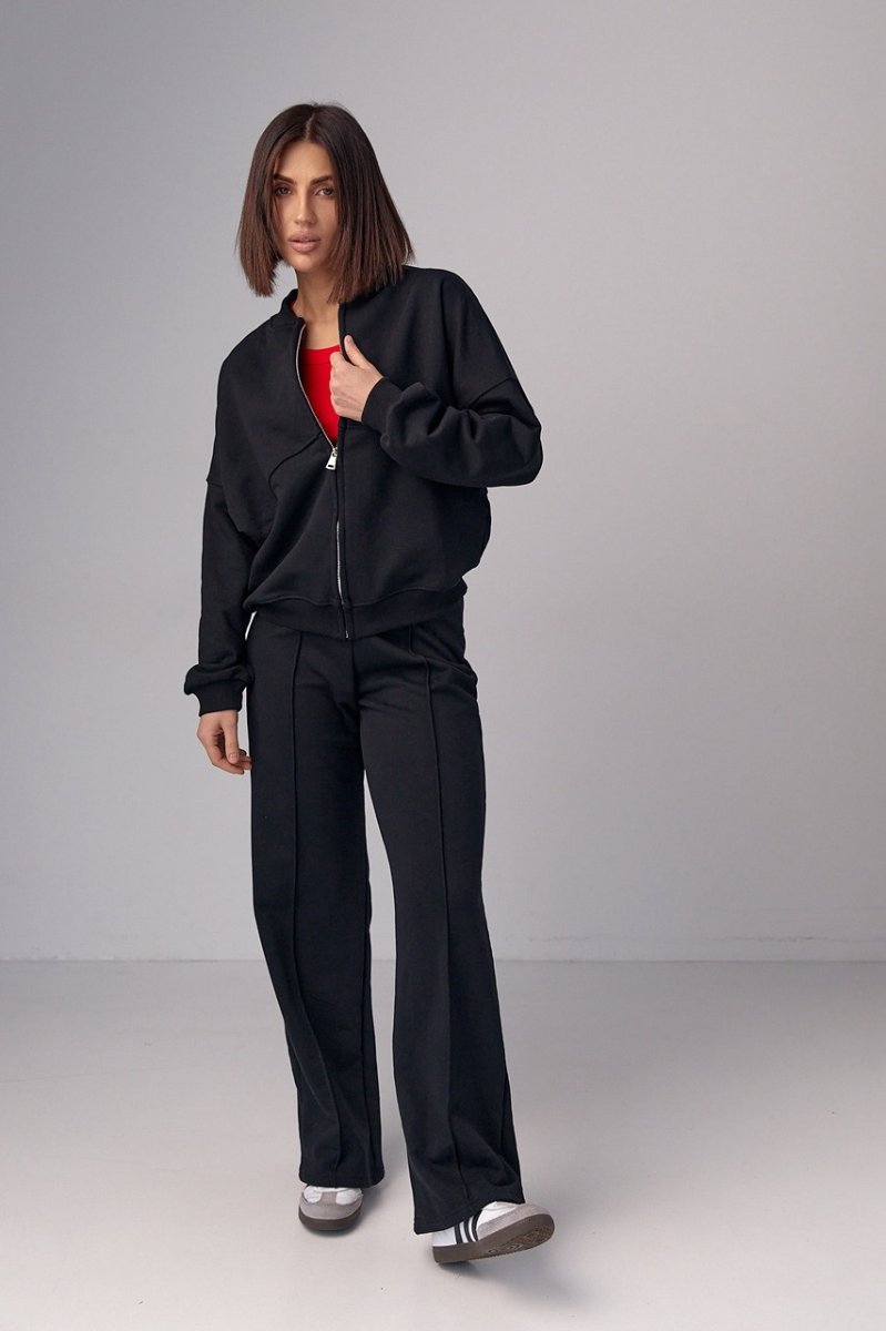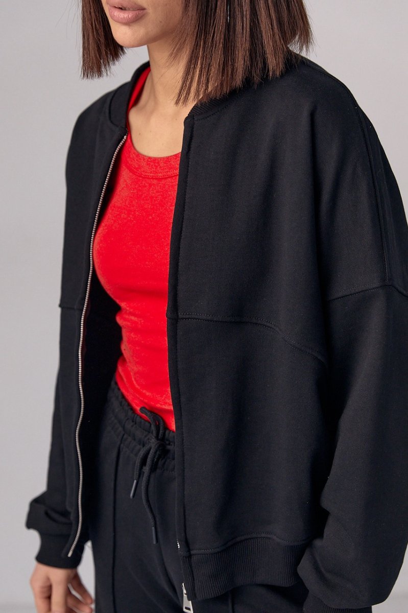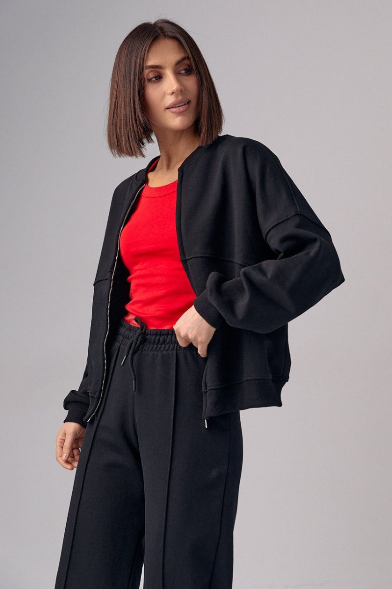 В кофте манжеты на рукавах и воротник-стойка на круглой горловине выполнены из рибаны в мелкий рубчик, а низ изделия дополнен трикотажным манжетом. Вверху изделия спереди и сзади расположены декоративные швы. Застегивается бомбер на металлическую молнию.