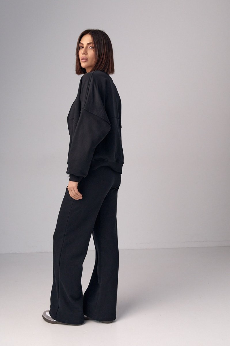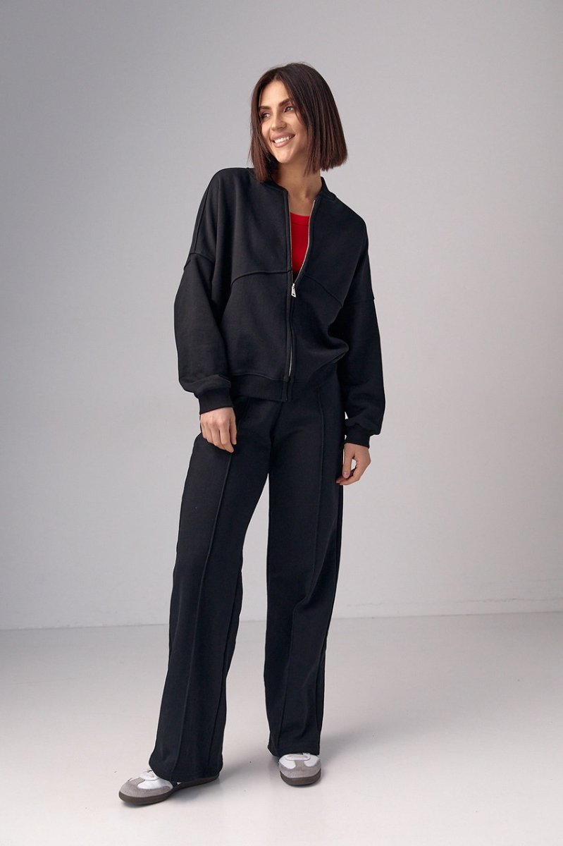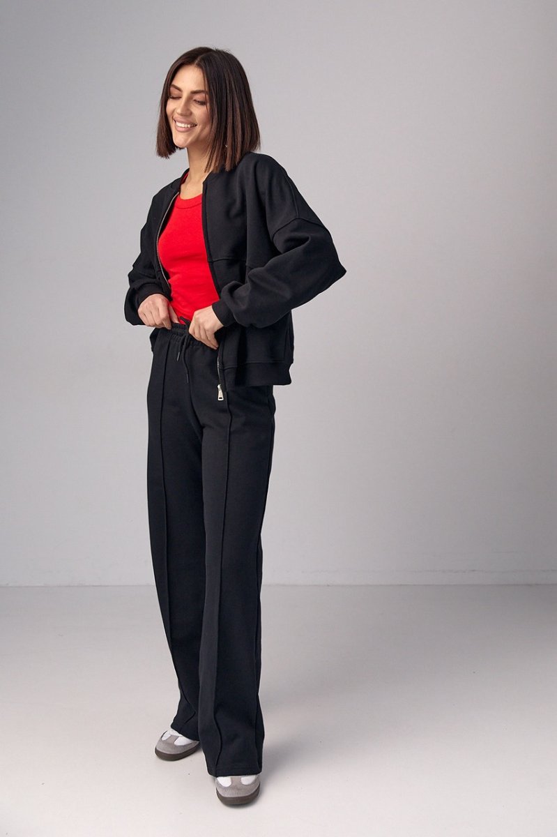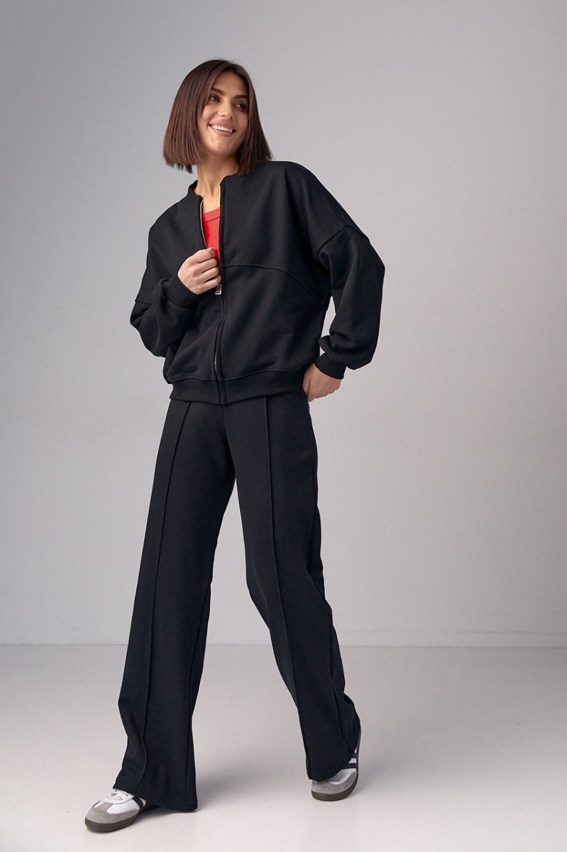 В кофте манжеты на рукавах и воротник-стойка на круглой горловине выполнены из рибаны в мелкий рубчик, а низ изделия дополнен трикотажным манжетом. Вверху изделия спереди и сзади расположены декоративные швы. Застегивается бомбер на металлическую молнию.
