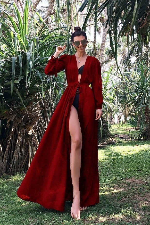 Туника из креп-шифона с длинным рукавом надежно и бережно укроет нежную кожу от палящих лучей раскаленного солнца. Вы будете выглядеть сногсшибательно и защищенно на пляже этим летом.