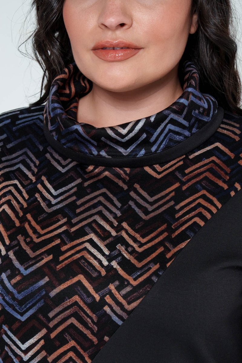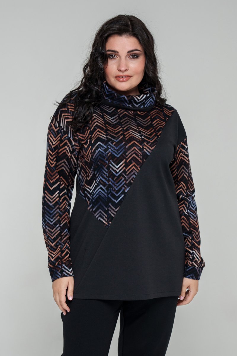 Туника прямого силуэта выполнена в сочетании ткани джерси (верх) и плотного трикотажа (низ). Перед – асимметричный с красивыми принтованными вставками. Воротник – хомут, спущенное плечо, рукав втачной одношовный на манжете. Спинка со средним швом, удлиненная. В боковых швах выполнены разрезы.
