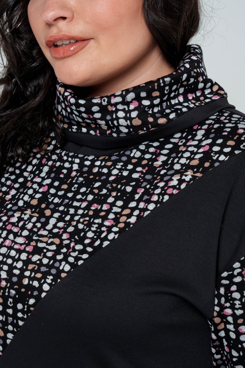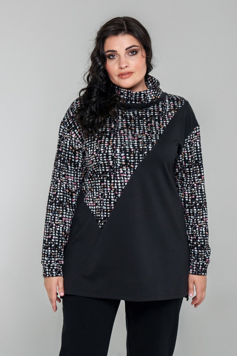 Туника прямого силуэта выполнена в сочетании ткани джерси (верх) и плотного трикотажа (низ). Перед – асимметричный с красивыми принтованными вставками. Воротник – хомут, спущенное плечо, рукав втачной одношовный на манжете. Спинка со средним швом, удлиненная. В боковых швах выполнены разрезы.