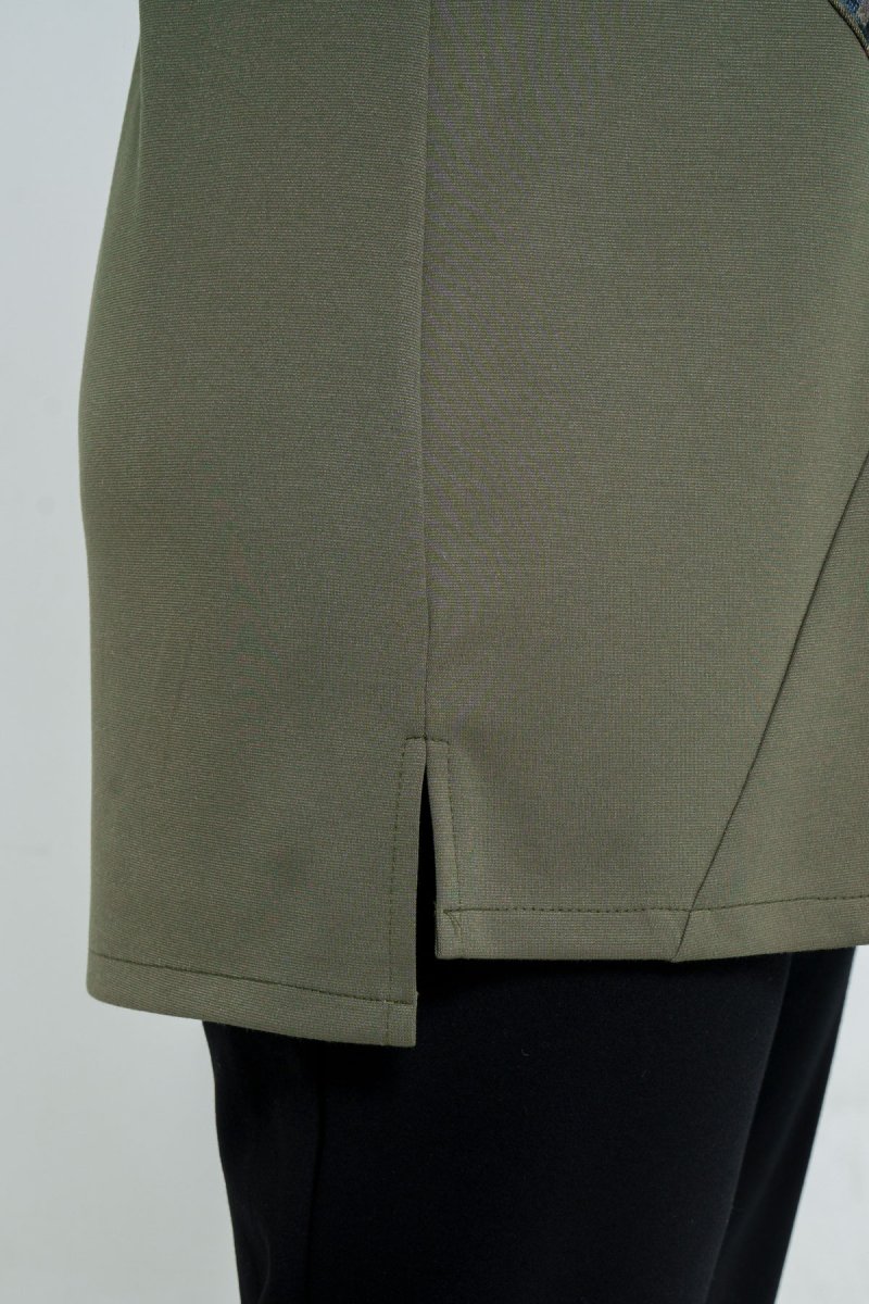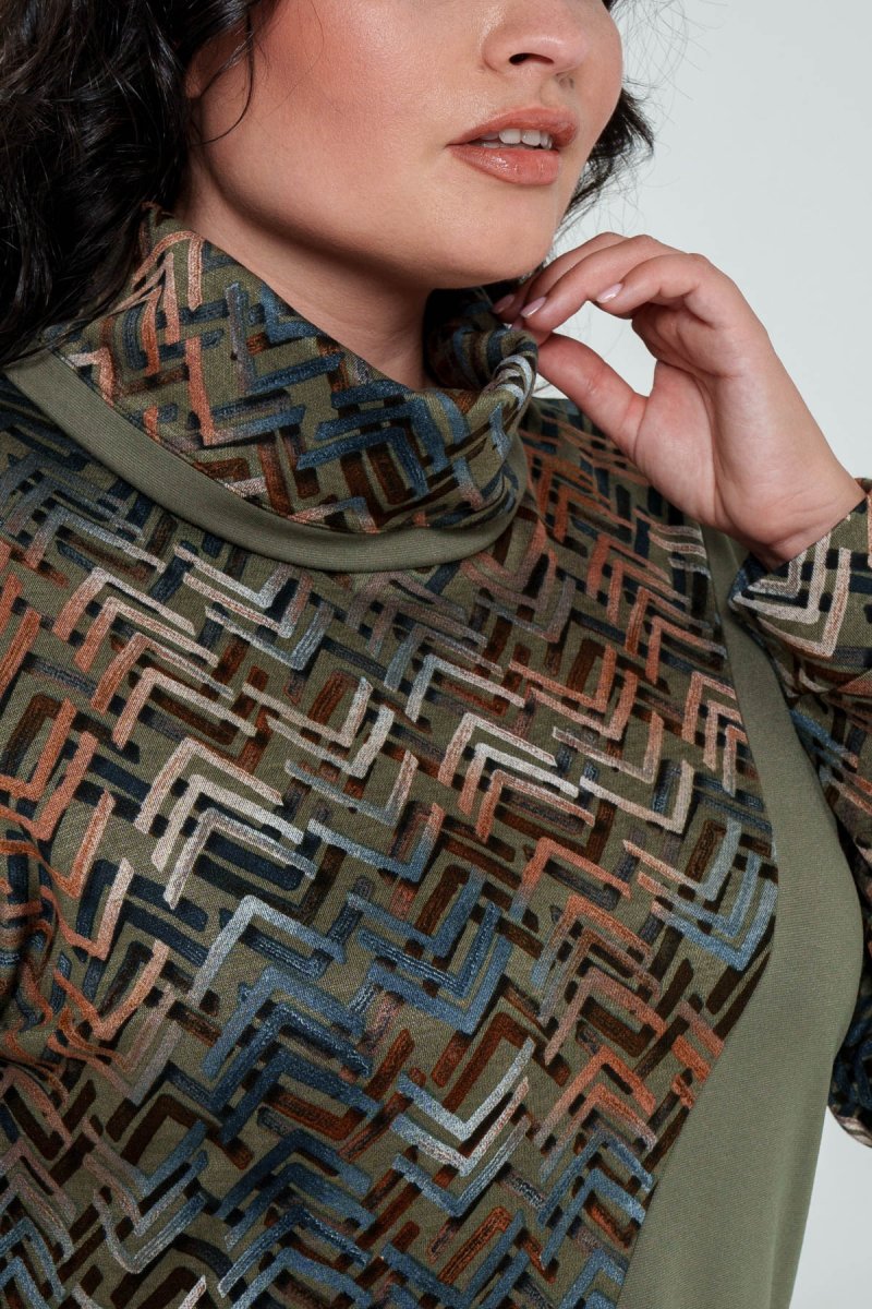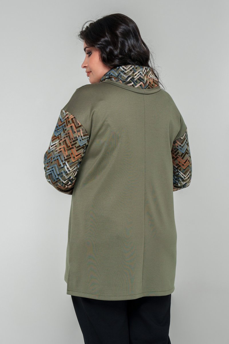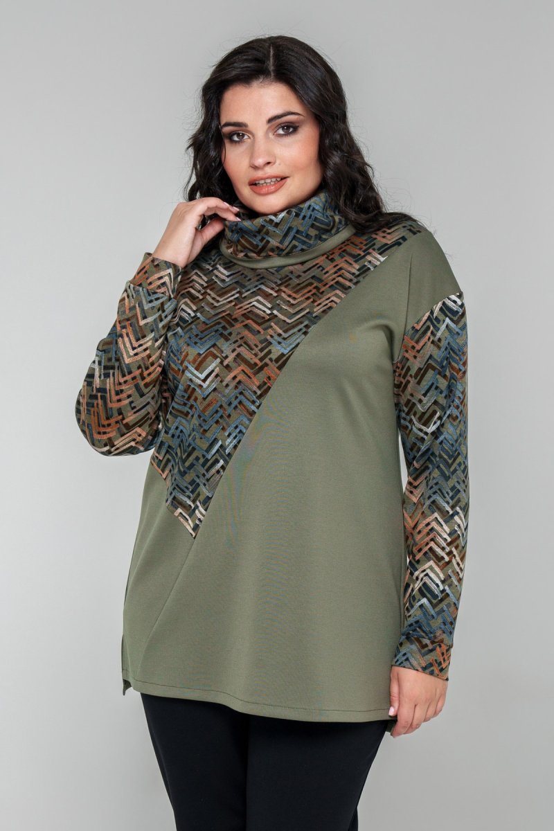 Туника прямого силуэта выполнена в сочетании ткани джерси (верх) и плотного трикотажа (низ). Перед – асимметричный с красивыми принтованными вставками. Воротник – хомут, спущенное плечо, рукав втачной одношовный на манжете. Спинка со средним швом, удлиненная. В боковых швах выполнены разрезы.