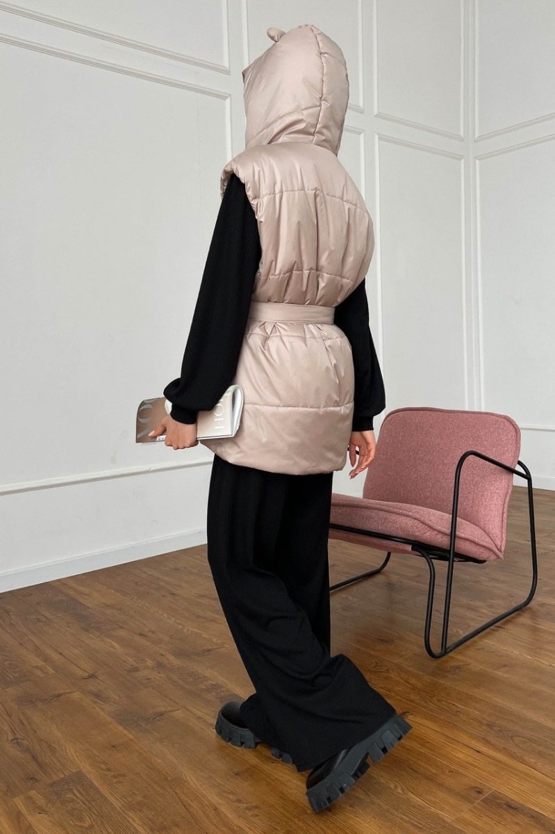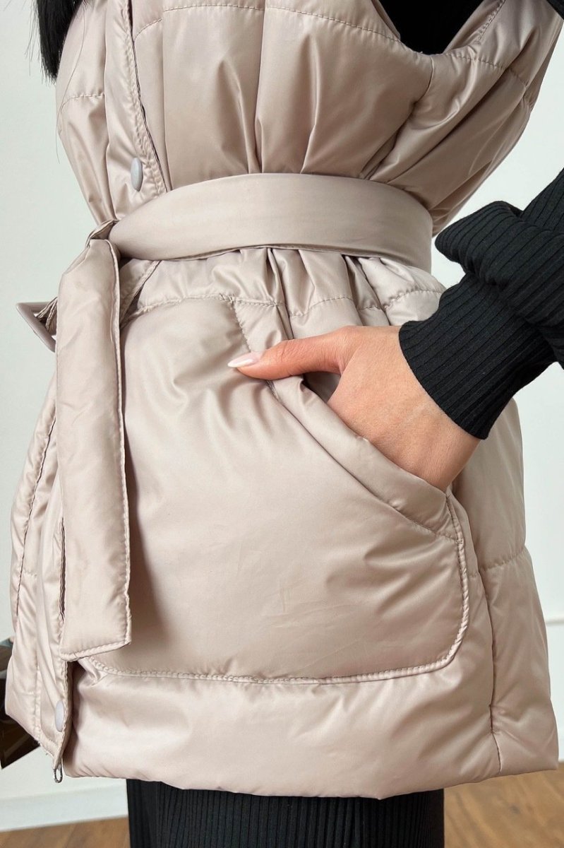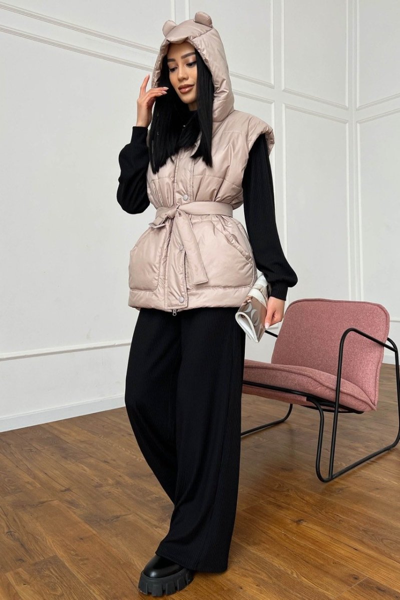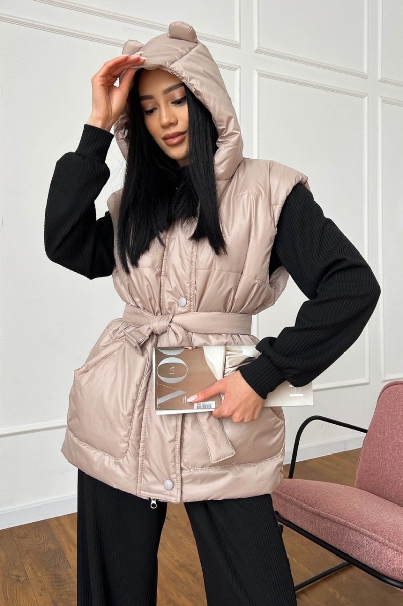 Наша новинка – стильный удлиненный жилет из плащевки на молнии и кнопках с капюшоном. В качестве утеплителя выступает синтепух (150 г/м2). Модель представлена в актуальных в этом сезоне цветах на любой вкус. Жилет декорирован милыми ушками на капюшоне. Большие накладные карманы придают практичности и удобству. Пояс в комплекте.