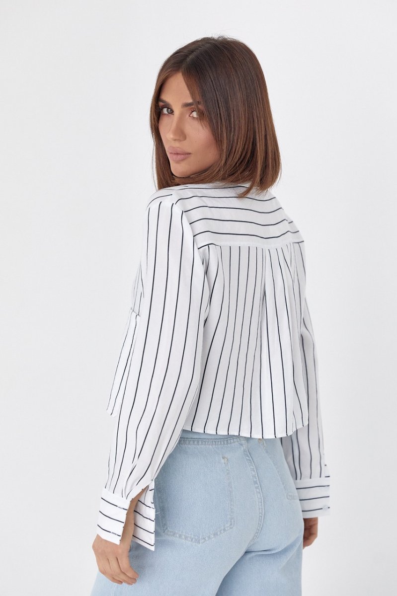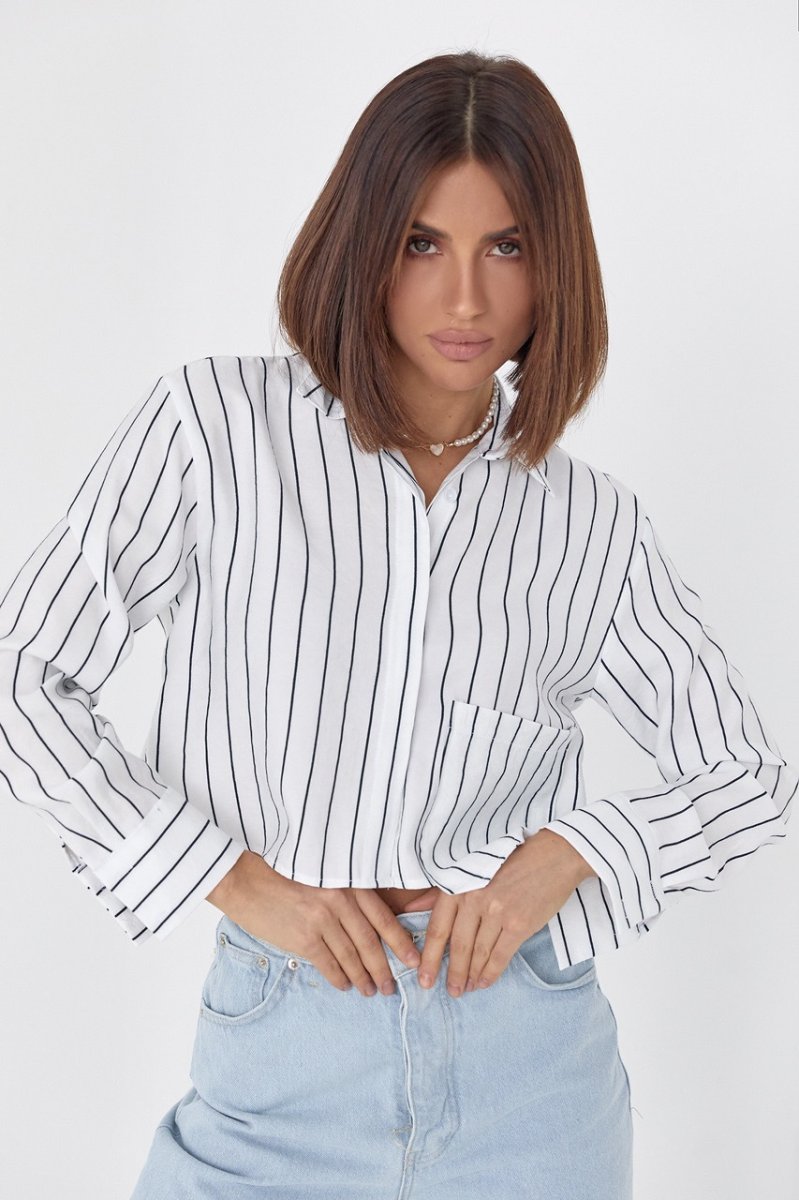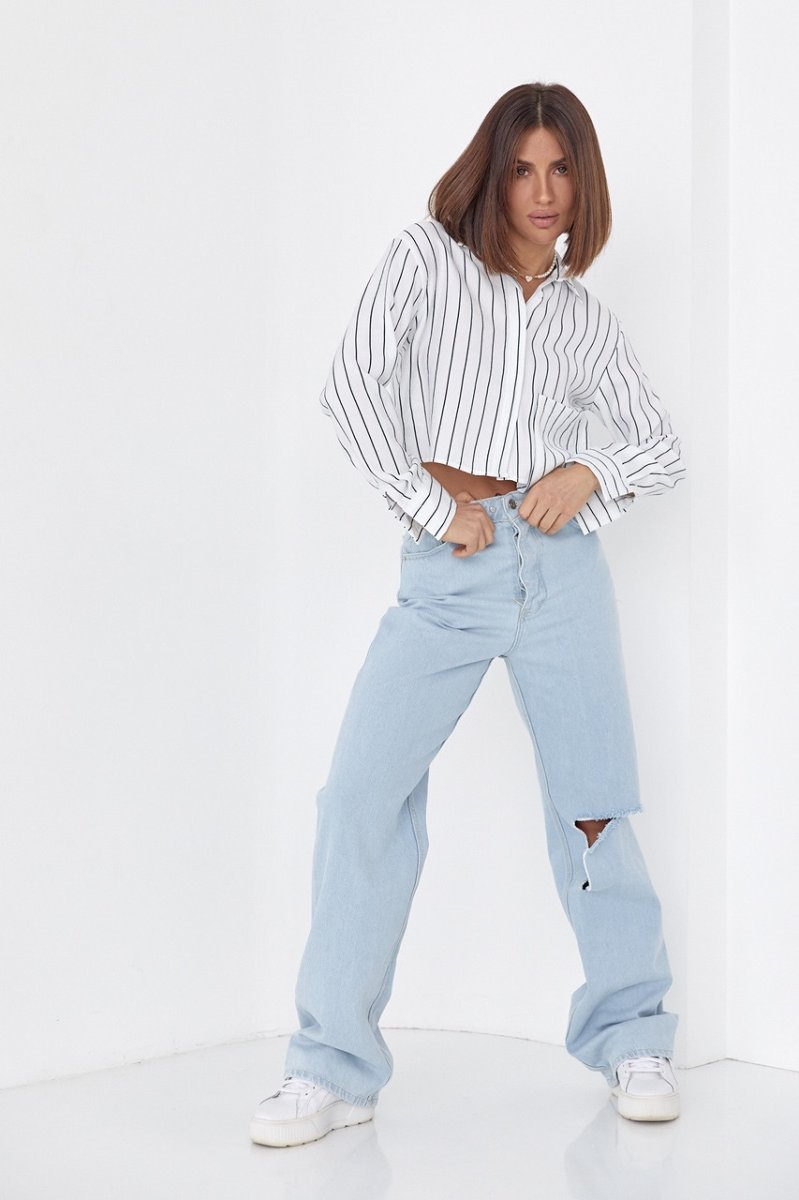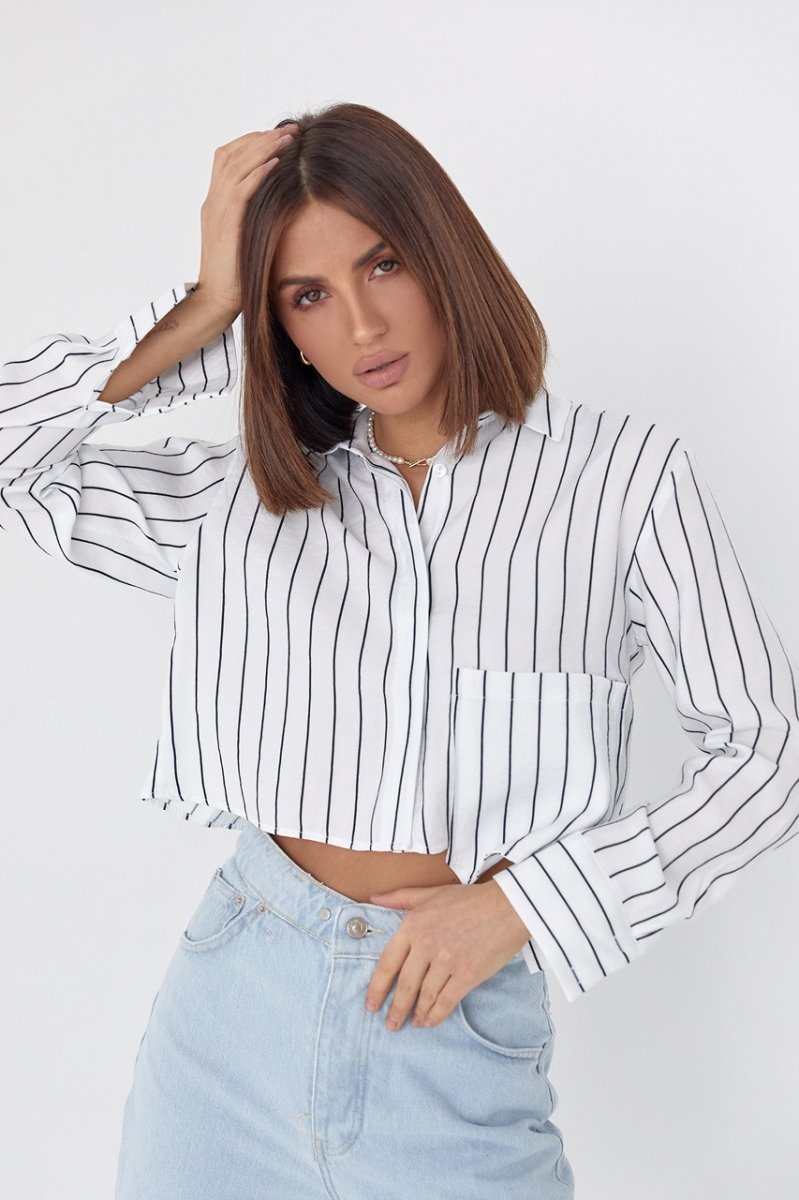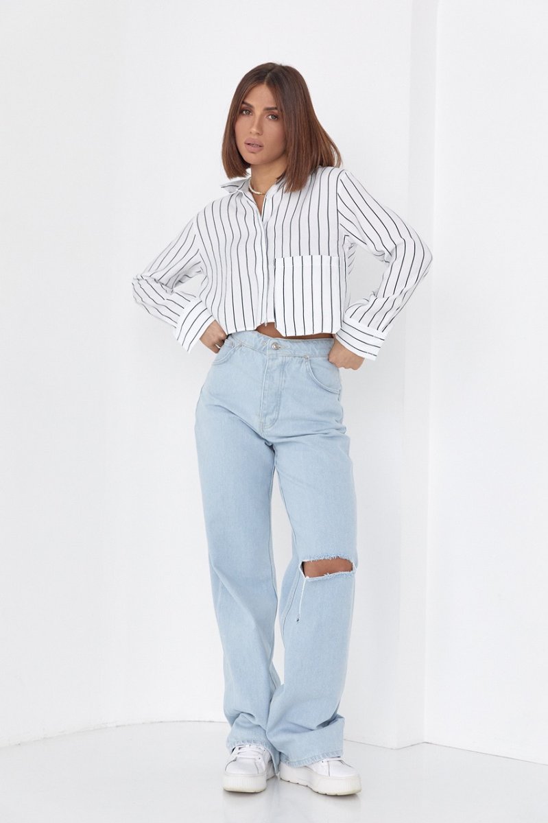 Если ты любишь штаны и юбки с высокой линией талии, тогда тебе точно пригодится укороченная женская рубашка в полоску.