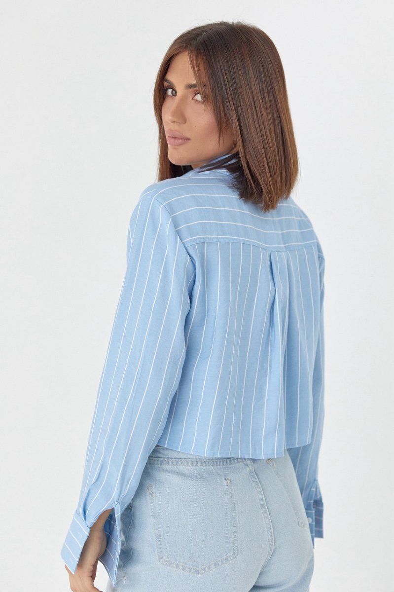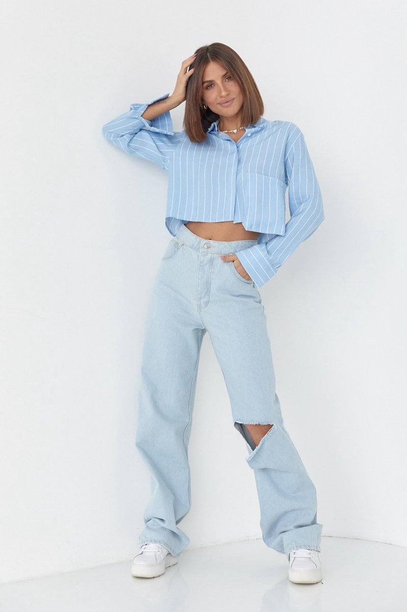 Если ты любишь штаны и юбки с высокой линией талии, тогда тебе точно пригодится укороченная женская рубашка в полоску.