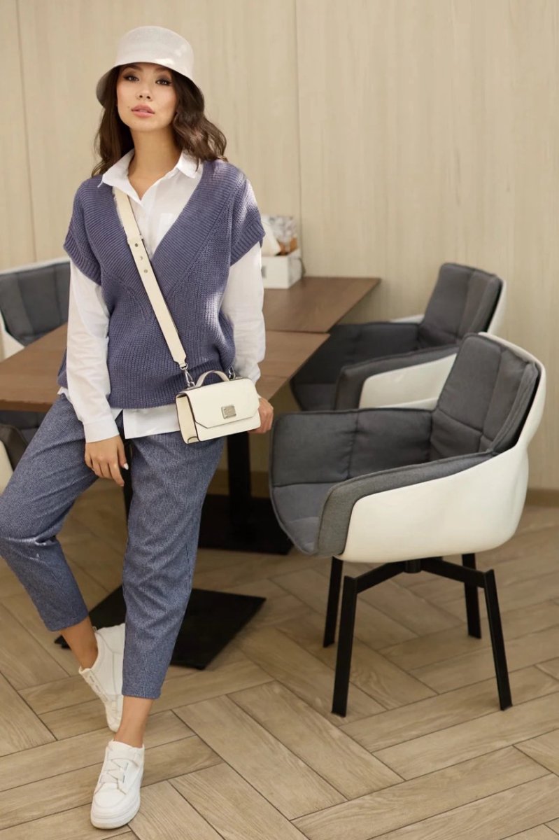 Укороченные брюки давно стали базовой вещью. Приятный материал к телу – итальянский кашемир. К низу идут зауженные. Застежка в виде потайной молнии и пуговицы. Есть карманы с отрезным бочком.