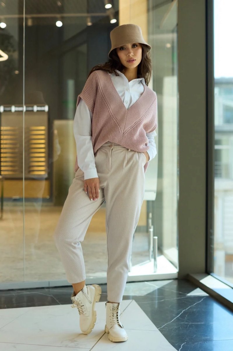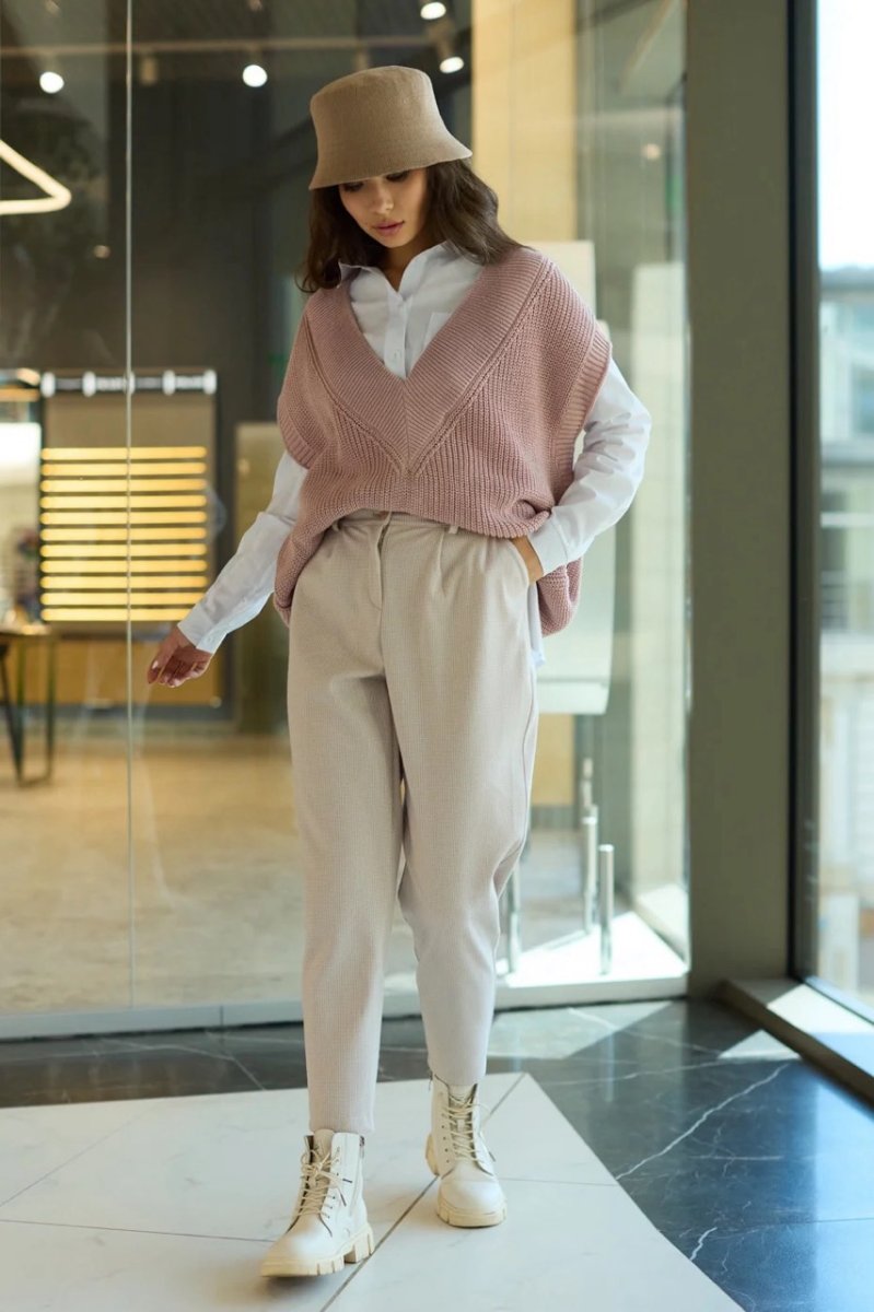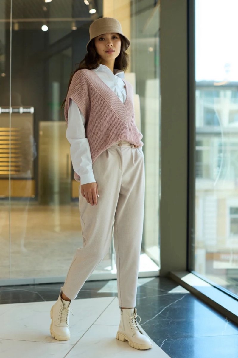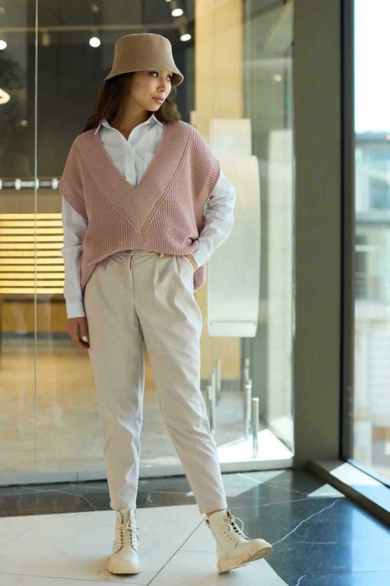 Укороченные брюки давно стали базовой вещью. Приятный материал к телу – итальянский кашемир. К низу идут зауженные. Застежка в виде потайной молнии и пуговицы. Есть карманы с отрезным бочком.