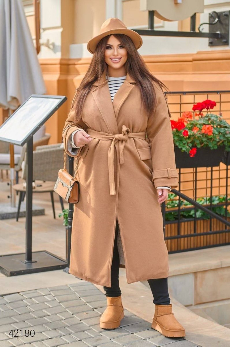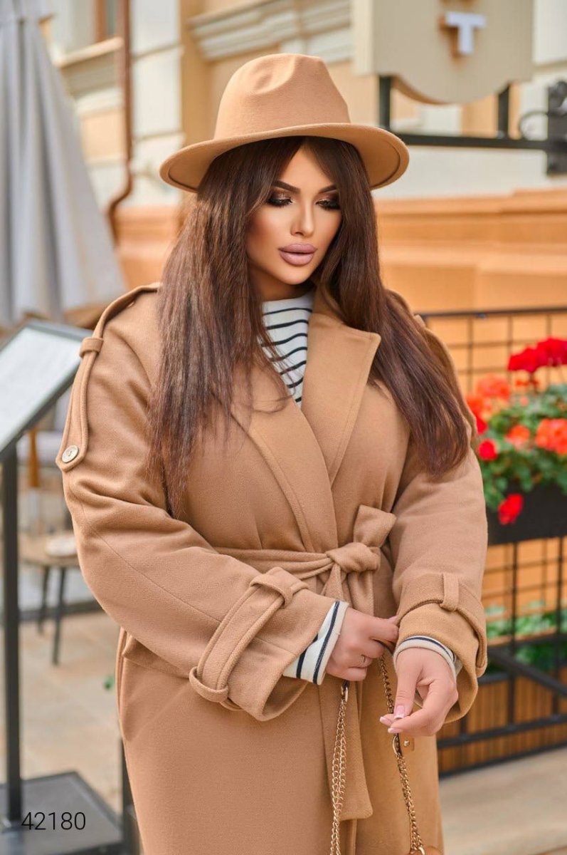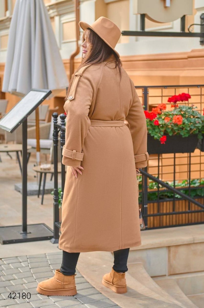 Утепленное женское пальто. Не кашлатится. Утепленная подкладка на синтепоне 80. Два боковых кармана. Одевается на запах, завязывается поясом. Декорировано на рукавах и плечах. Крой – реглан.