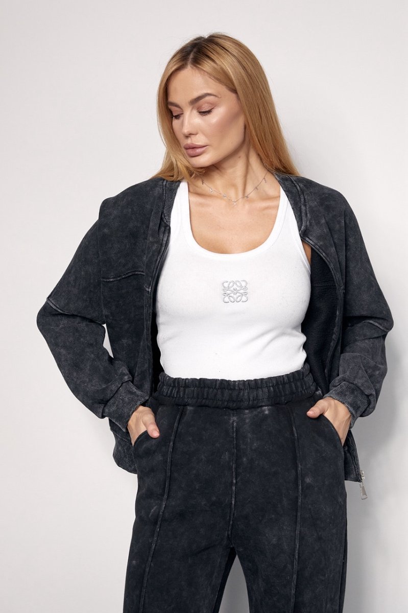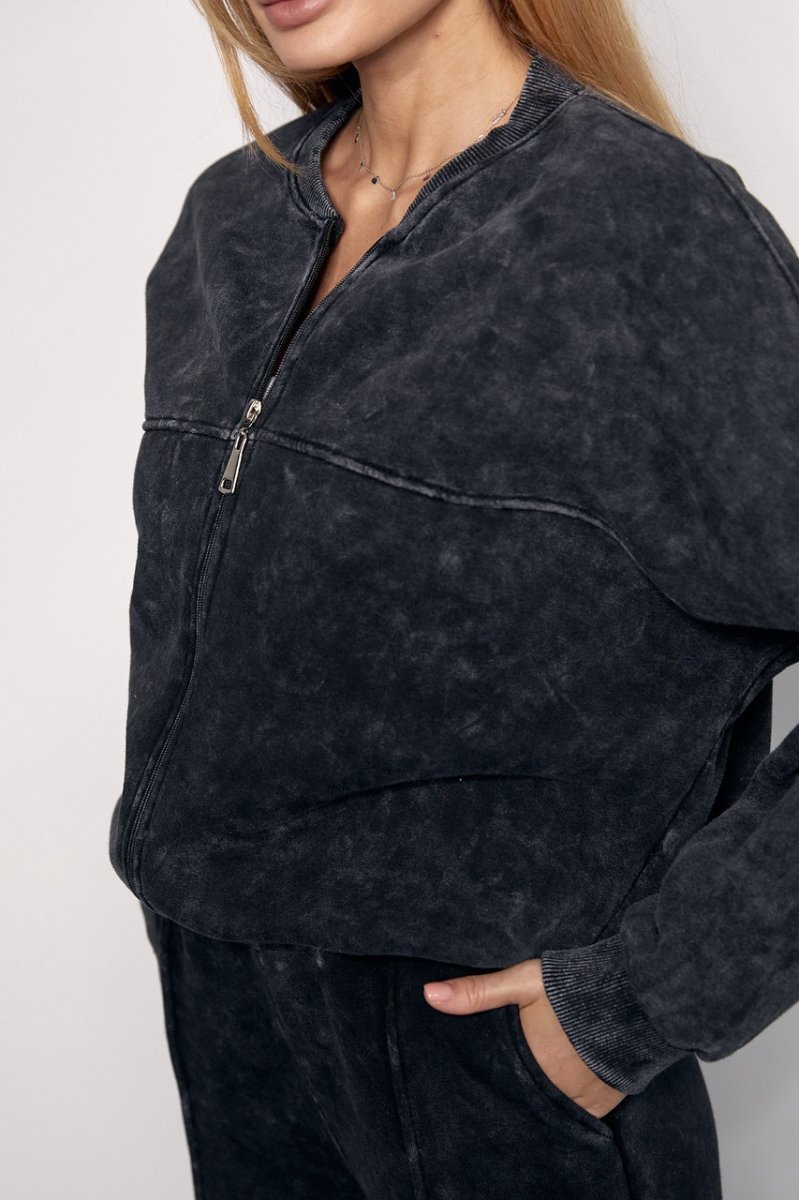 В кофте манжеты на рукавах и воротник-стойка на круглой горловине выполнены из рибаны в мелкий рубчик, а низ изделия дополнен трикотажным манжетом. Вверху изделия спереди и сзади расположены декоративные швы. Застегивается бомбер на металлическую молнию.