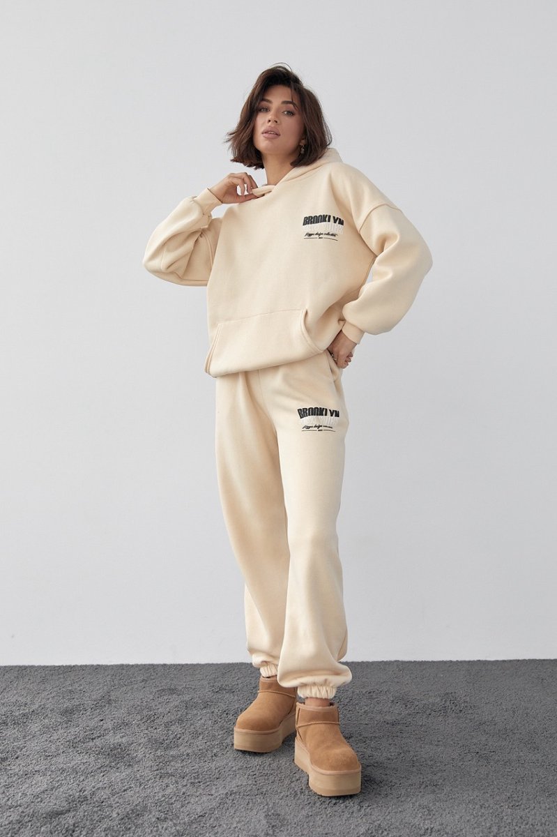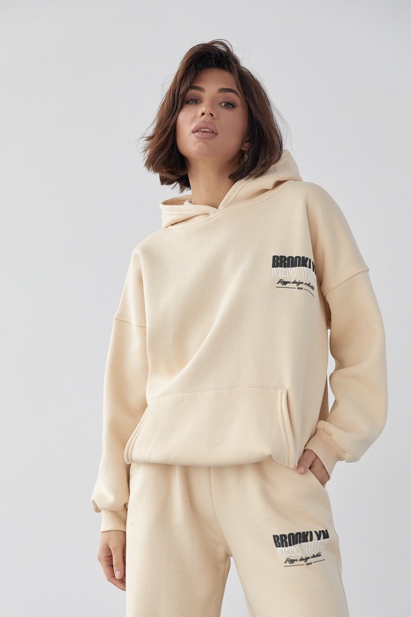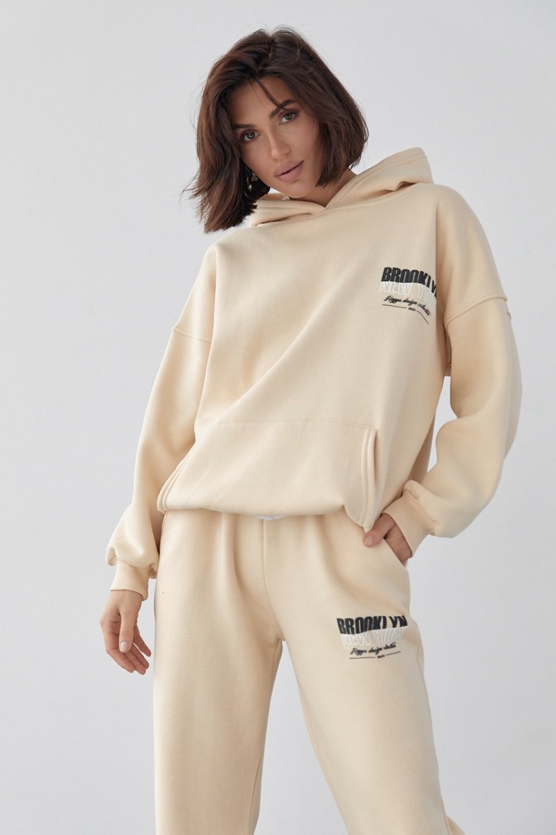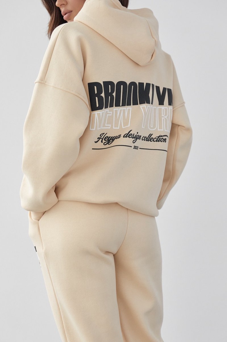 В штанах в поясе вшита широкая резинка с завязками, низ также собран на резинку. В боковых швах вверху расположены удобные прорезные кармашки. Капюшон в худи выполнен без подкладки, прямой низ изделия и длинные рукава обшиты манжетами. Спереди внизу нашит карман-кенгуру, а проймы идут с дополнительной декоративной строчкой. Спереди, с левой стороны, кофта украшена принтованной надписью "Brooklin New York", а на джоггерах аналогичная надпись расположена слева вверху.