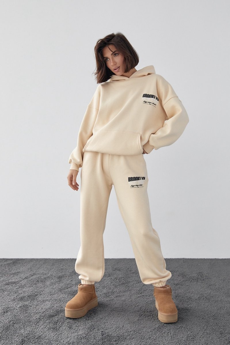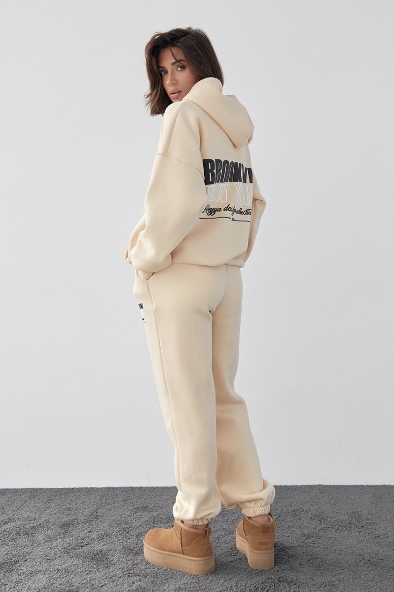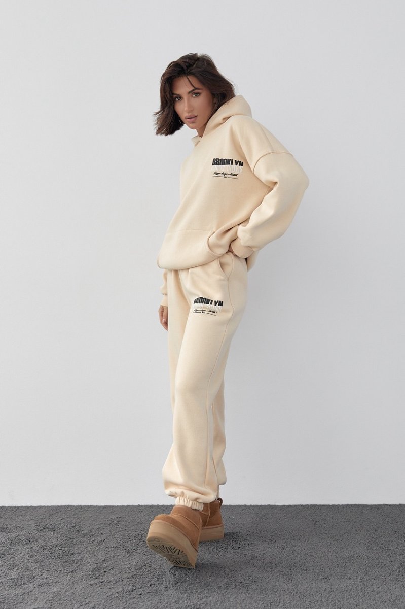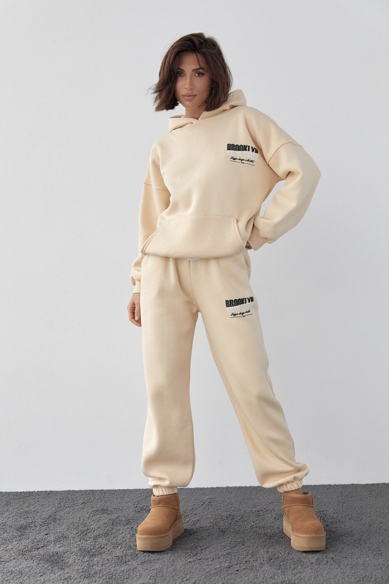 В штанах в поясе вшита широкая резинка с завязками, низ также собран на резинку. В боковых швах вверху расположены удобные прорезные кармашки. Капюшон в худи выполнен без подкладки, прямой низ изделия и длинные рукава обшиты манжетами. Спереди внизу нашит карман-кенгуру, а проймы идут с дополнительной декоративной строчкой. Спереди, с левой стороны, кофта украшена принтованной надписью "Brooklin New York", а на джоггерах аналогичная надпись расположена слева вверху.
