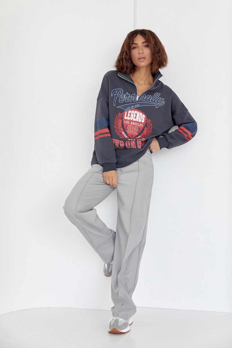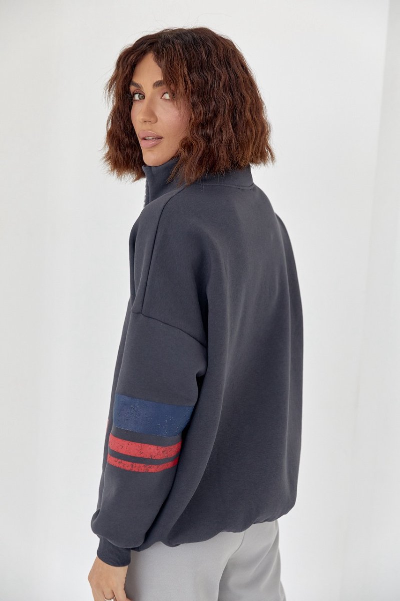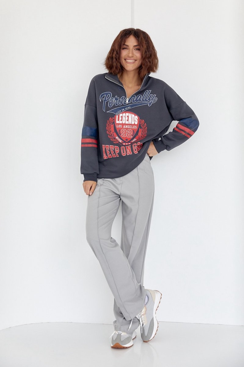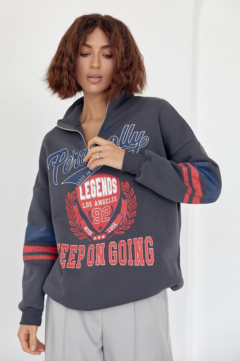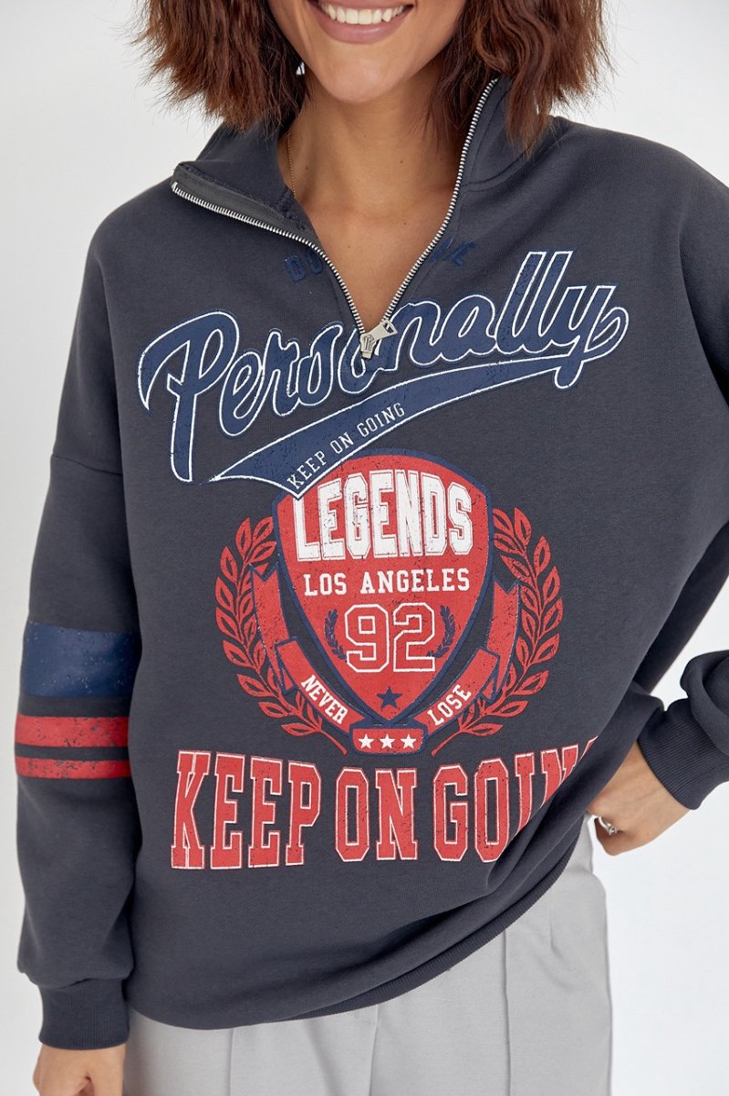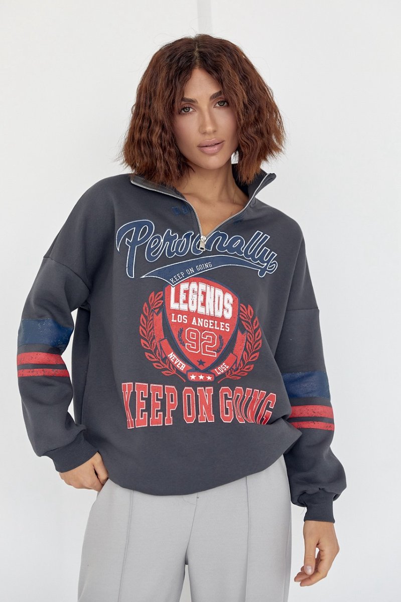 Этот свободный свитшот порадует модниц удобным кроем и оригинальным дизайном. В модели прямой низ и длинные рукава обшиты манжетами из рибаны. Круглая горловина идет с воротником-стойкой, а спереди вверху изделие застегивается на короткую металлическую молнию. Также передняя часть кофты и основная часть рукавов украшены принтом.